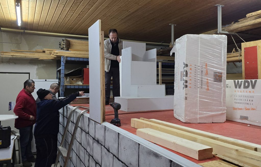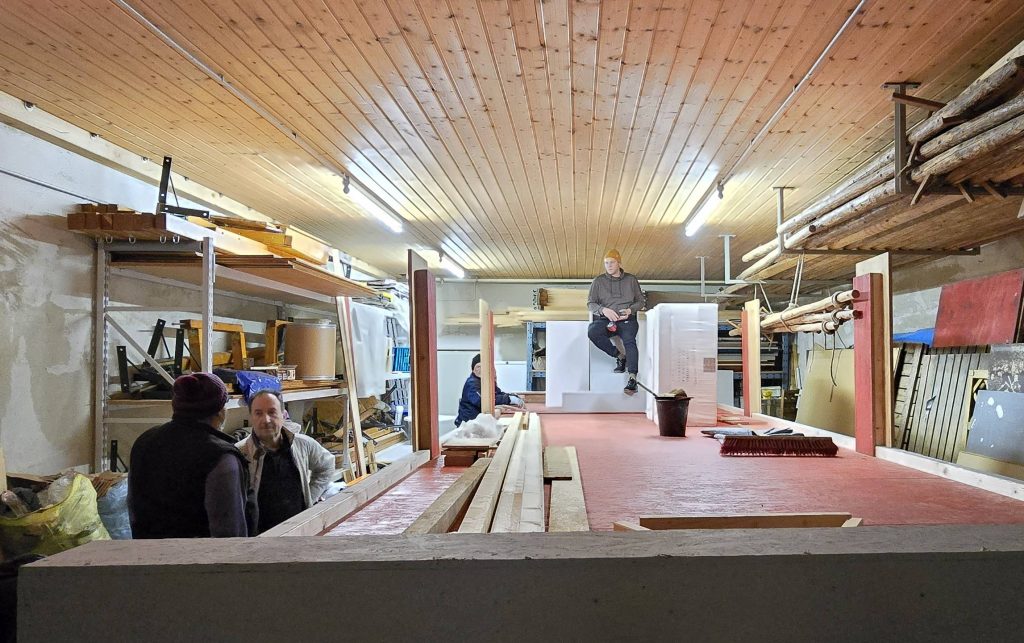 Rudolf Schwägerl von den Hänsele erklärt, die Arbeitsgruppe habe das Konzept für den Wagen gemeinsam entwickelt und setze die Pläne nun um. Dabei hätten sie sich einen früheren Wagen als Vorbild genommen. Allerdings sind sie nicht ganz frei, sondern müssen aus Sicherheitsgründen und TÜV-Vorschriften bestimmte Dinge einhalten: Seitlich muss überall eine Verkleidung sein, damit niemand unter die Räder geraten kann, aber gleichzeitig müssen die Reifen in Kurven genug Spielraum haben. Ein Geländer ist ebenfalls nötig und der Wagen darf auch nur eine bestimmte Höhe haben, wobei das Team in der kleinen Halle ohnehin durch die Decke begrenzt ist.