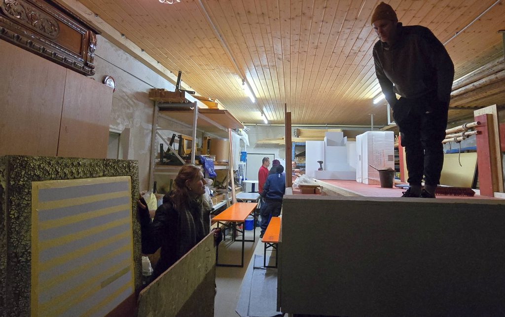 Angehörige verschiedener Gliederungen arbeiten fleißig am Umzugswagen der elf Meter lang und fahrbahnbreit ist. Um einen Thron herum gestalten sie Felsbrocken aus Styropor, das bemalt wird. Dazu kommen auch Tannen als Wald, erzählt Narrenbüttel Matthias Stolp, der Bauleiter in der Gruppe. Zu diesen großen Arbeiten gesellen sich auch die filigranen Aufgaben, um Steine echt-wirkend zu malen und den Hauptbrief für das Narrengericht-Privileg mit in schönen großen Buchstaben zu schreiben. Das Material sei teilweise aus Restbeständen, anderes sei dazugekauft worden. Farben habe die zehnköpfige Gruppe zum Beispiel vom Malerbetrieb Walter erhalten.
