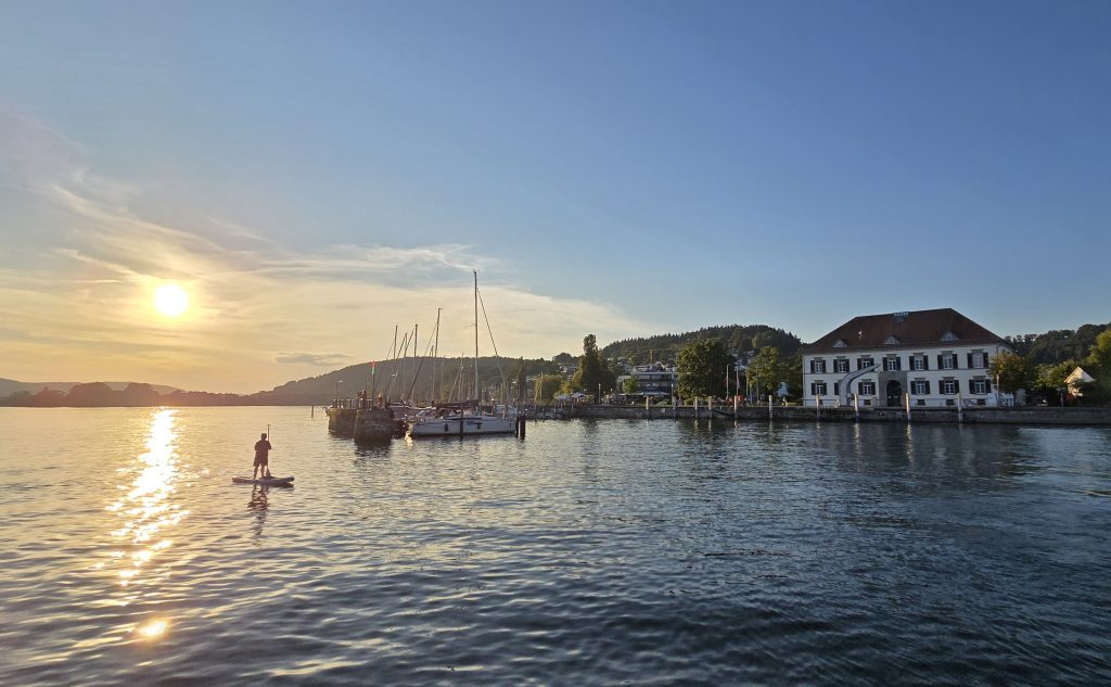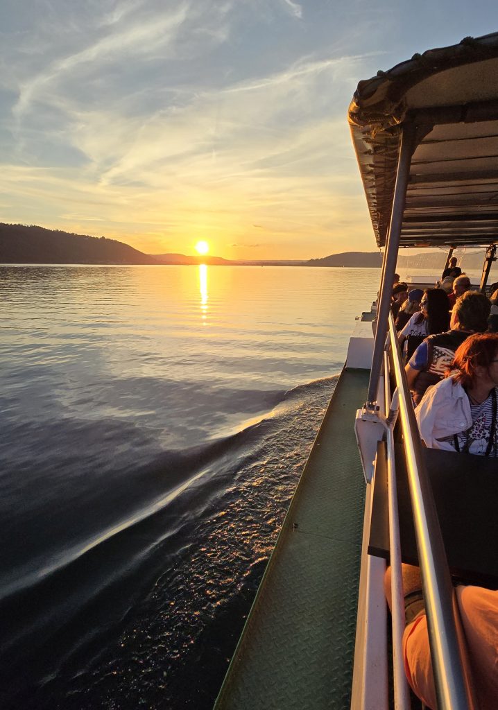 Wenn im August auch noch der Sonnenuntergang dazu kommt, ist die Stimmung noch ein Stückchen perfekter. Das warme Abendlicht und die Sonnenkugel, die je nach Position des Schiffs über oder neben der Ruine Bodman steht, hat etwas Magisches.