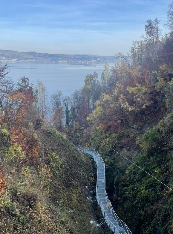 Da immer wieder die Frage aufkomme, warum der Steg eigentlich aus Metall gebaut wurde, fasste Bürgermeister Christoph Stolz nochmal die Hintergrunde mit der Gefahr von Rutschungen zusammen. Der Steg ist so konstruiert, dass loses Gestein oder Erde zwischen Felswand und Steg hindurchfallen kann. Sollte ein Teil mal beschädigt werden, kann es einzeln getauscht werden.