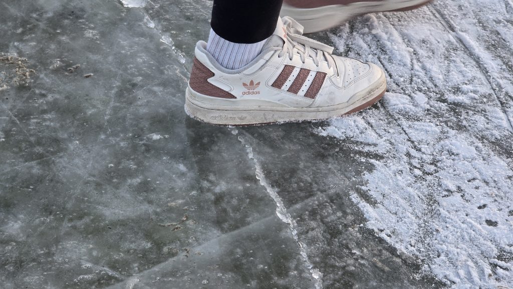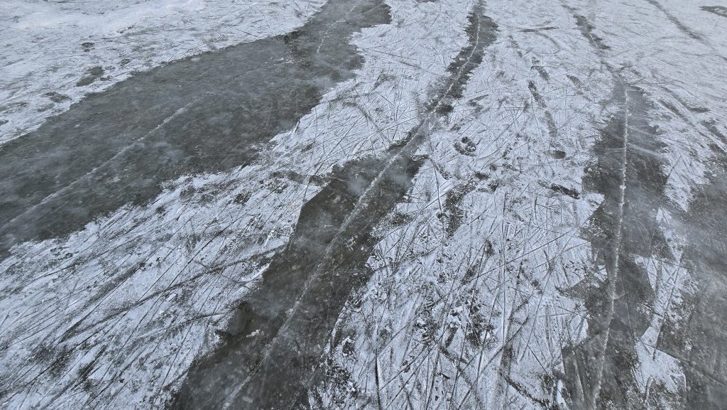 Einige Stellen auf dem dortigen Eis sehen bedenklich aus, während andere dick und tragfähig wirken. Ein dicker Riss, durch den ein bisschen Wasser schwappt und mehrere Pfützen interessieren eigentlich keinen, der dort läuft oder Schlittschuh fährt. Alle fahren drüber oder um die Löcher herum. Sogar eine ältere Dame in einem elektrischen Rollstuhl fuhr in der Nähe dieser Stelle unbedarft über das Eis.