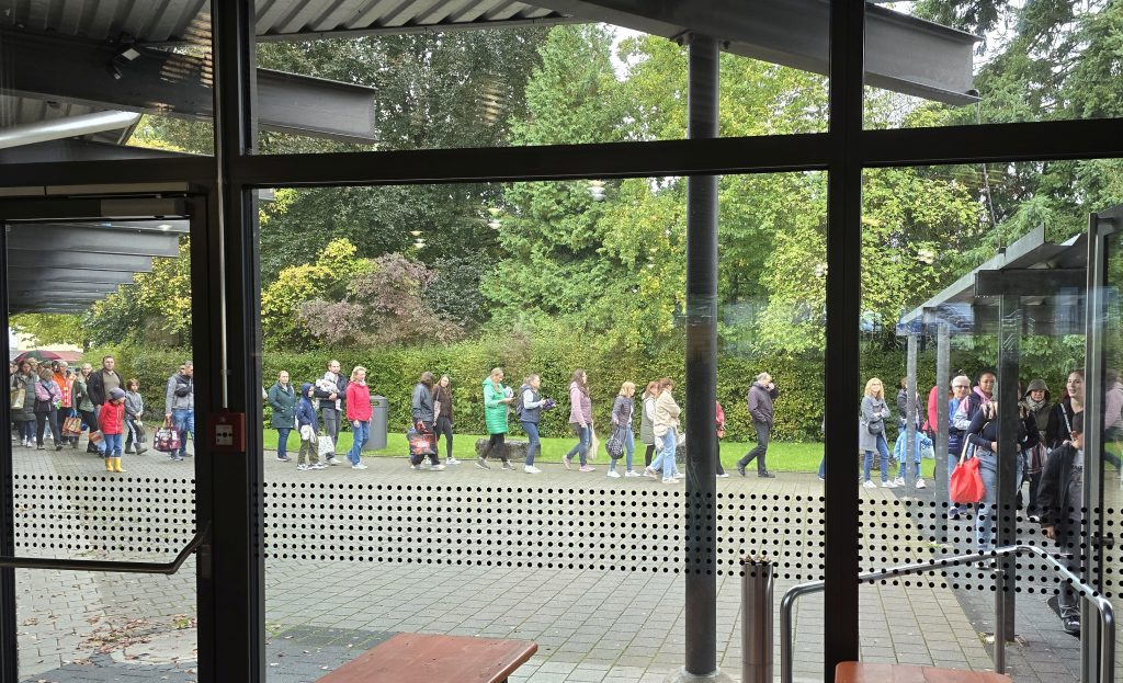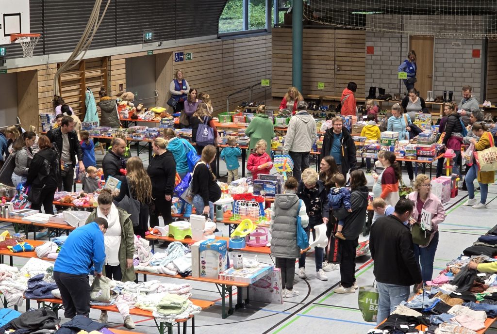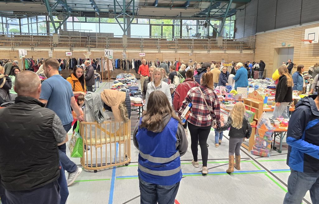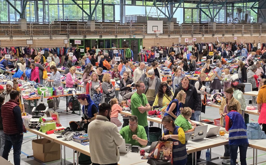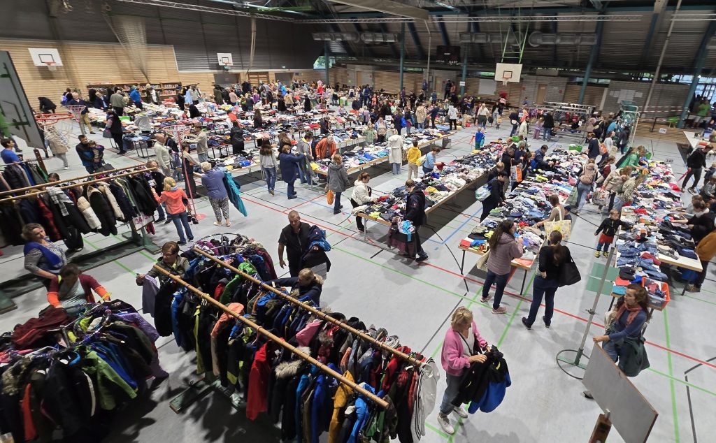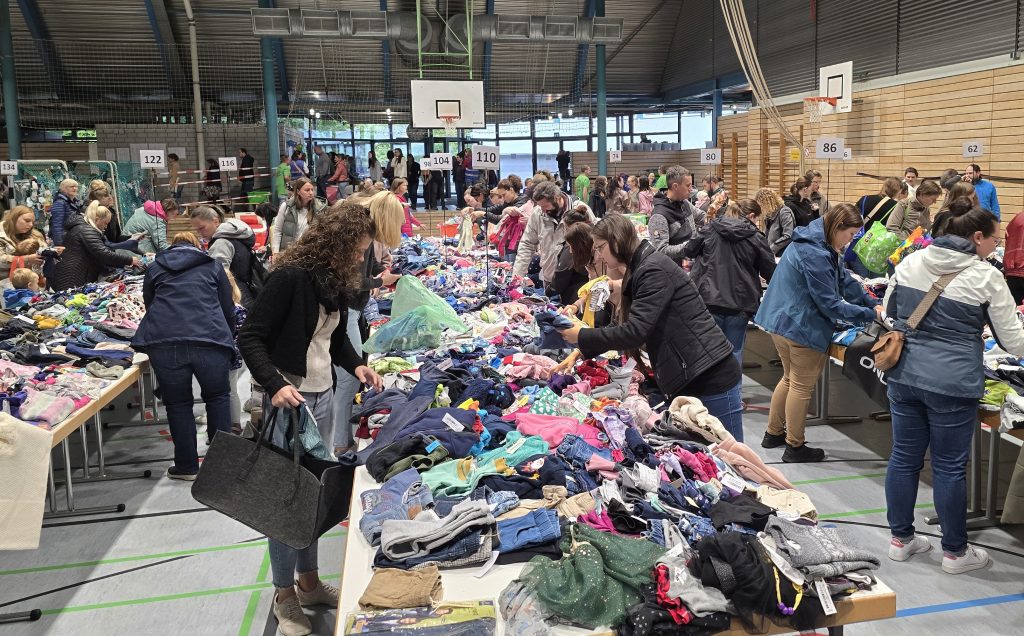 Glückliche, aber auch etwas gestresste Käufer verlassen schließlich die Jahnhalle. Kinder wachsen schnell und die Eltern oder Großeltern haben die nächsten Kleidungsgrößen, Schuhe oder Spielzeug für ihre Kinder ergattert – manche von ihnen sind gleichzeitig Anbieter und erfahren etwas später bei der Abrechnung, wie viel von den gebrachten Sachen sich verkauft haben.