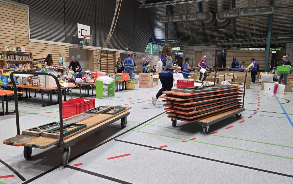 Für das günstige Second-Hand-Sachen-Kaufen und -Verkaufen ist ein unglaublicher Aufwand und sehr viel Arbeit notwendig. Einiges davon läuft sogar schon Monate vor der Veranstaltung: Papierkram, Planungen, Werbung, die Vergabe der Anbieternummern und direkt vor sowie nach der Veranstaltung die Einrichtung der Halle, das Kassieren und am Ende das Aufräumen und Abrechnen.