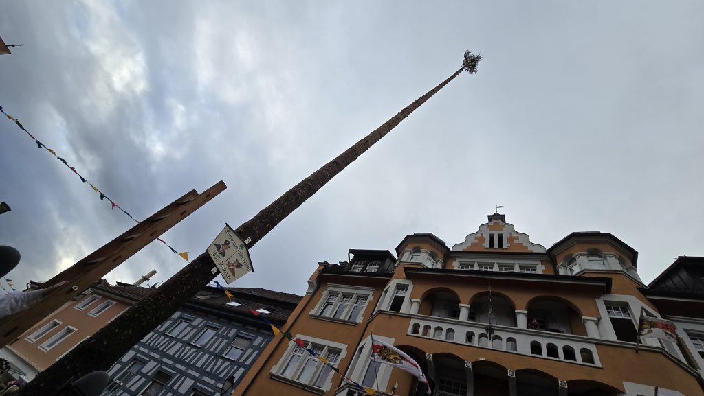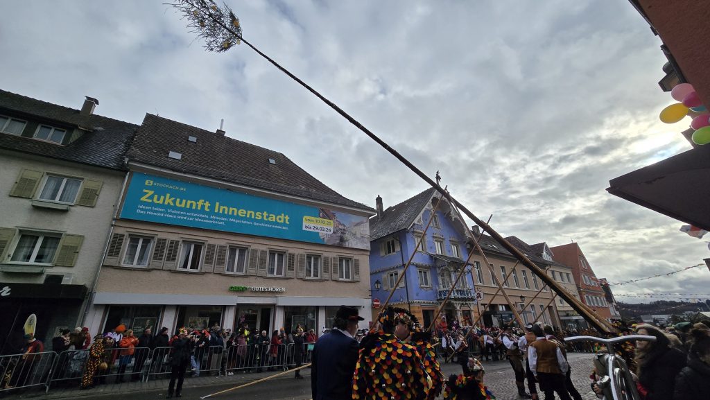 Jetzt steht er 30 Tage und prägt die Stockacher Oberstadt, da er weithin sichtbar ist: Der Stockacher Narrenbaum, ein elementares Stück Tradition in der Stockacher Fasnacht. Das Stellen am Schmotzigen Dunschtig fand bei sehr durchwachsenem Wetter statt: Bewölkt, leichter Regen, plötzlich strahlende Sonne, dann wieder Tropfen und Wolken.