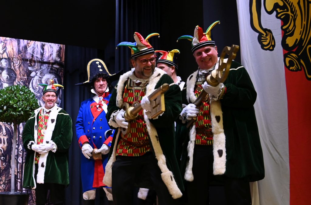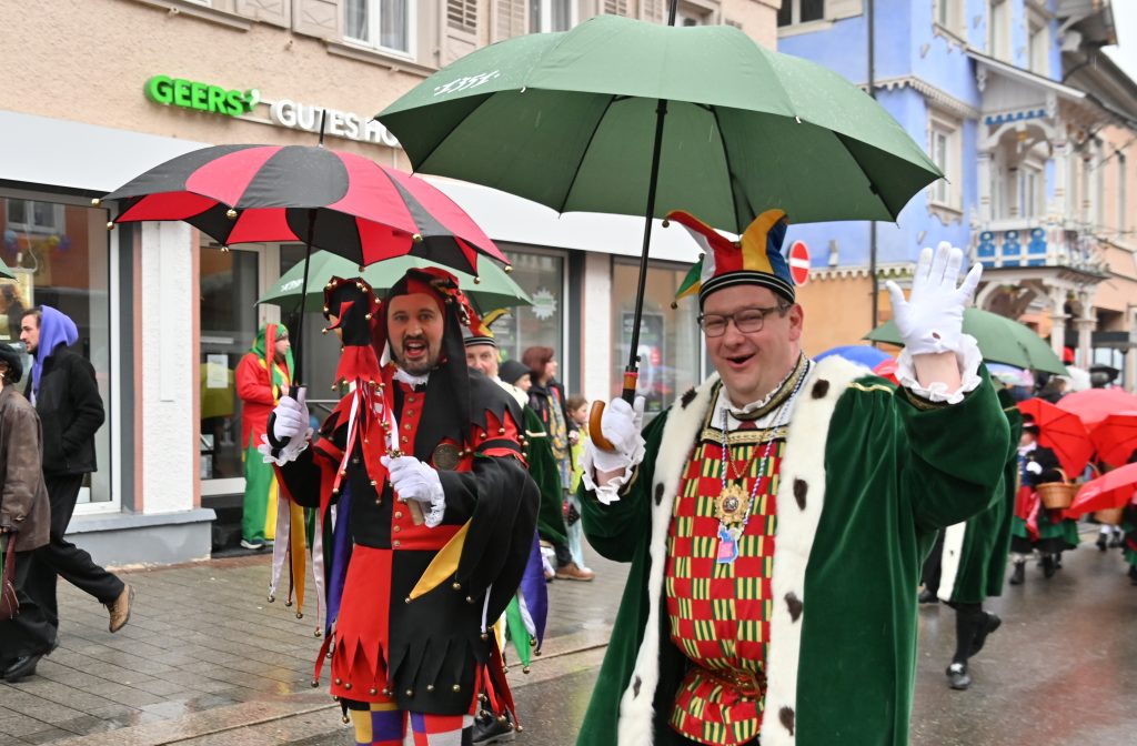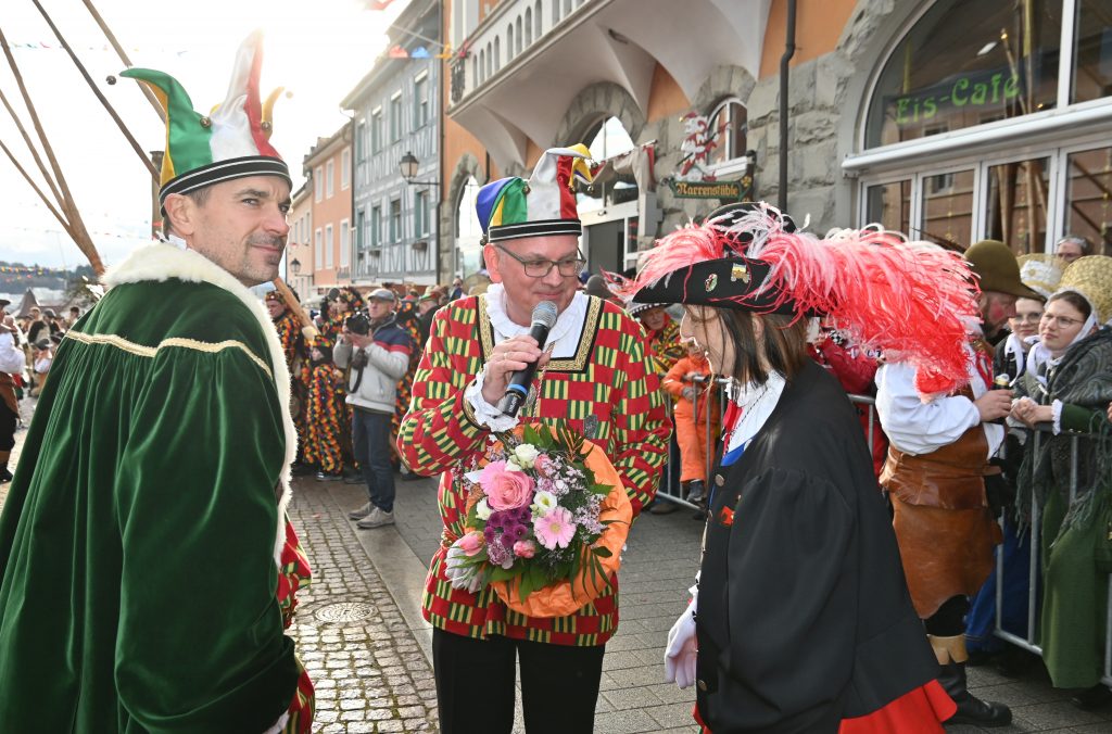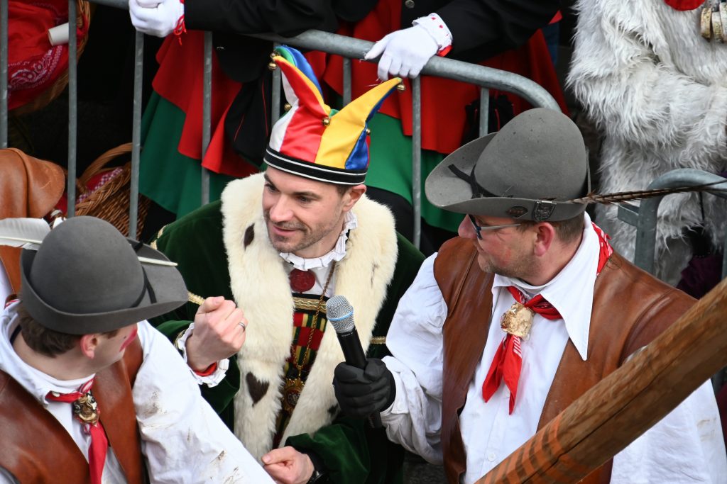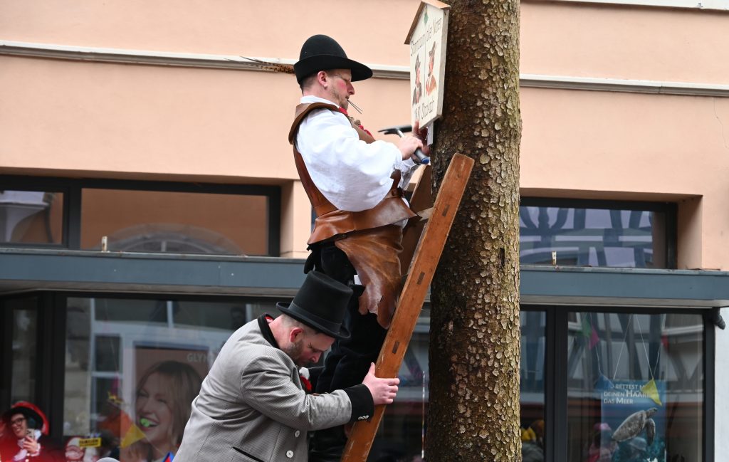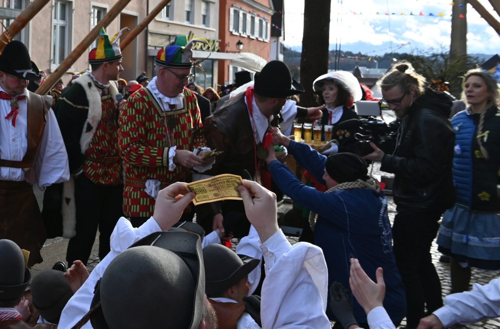 So fanden auch der Empfang im Bürgerhaus für geladene Gäste, die Kriegsratszene, die Übernahme der niederen Gerichtsbarkeit, der Narrenbaum-Umzug und das Stellen ohne den Ehrengast statt. Die Zimmerer streikten trotzdem kurz der bevor der Baum gerade stand. Ganz traditionell eben. Nach einer Stärkung mit Essen und Trinken sowie historischen 1000-Mark-Scheinen von Narrenrichter Jürgen Koterzyna folgte schließlich der Endspurt.