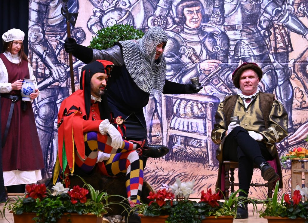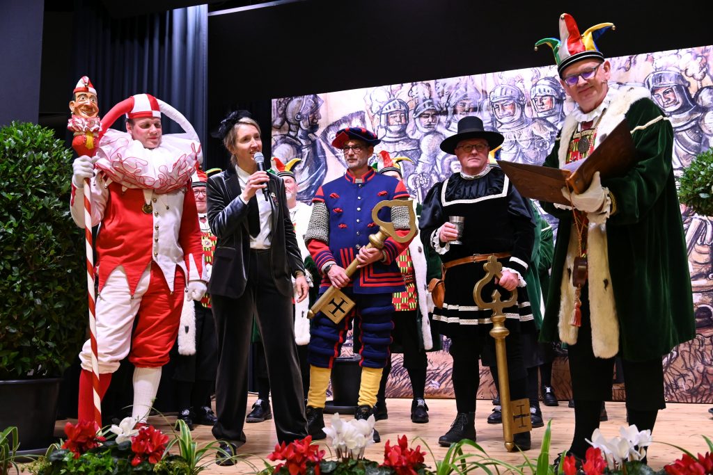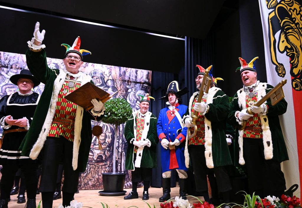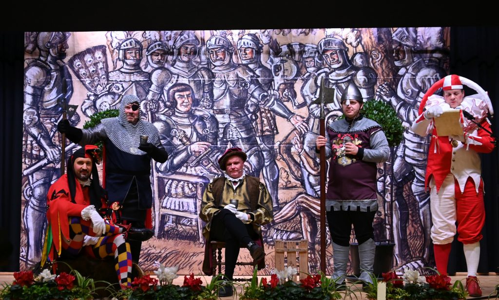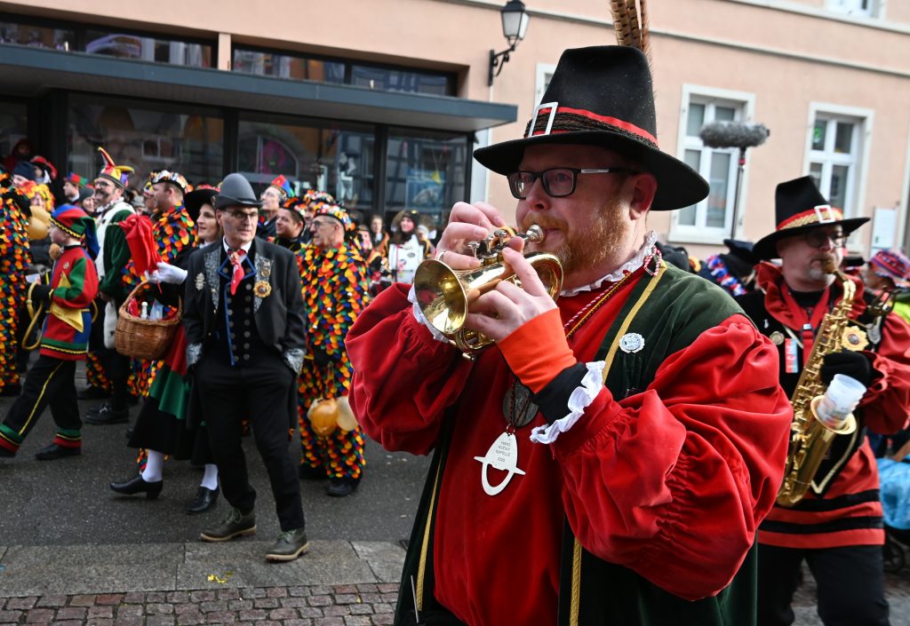 So fanden auch der Empfang im Bürgerhaus für geladene Gäste, die Kriegsratszene, die Übernahme der niederen Gerichtsbarkeit, der Narrenbaum-Umzug und das Stellen ohne den Ehrengast statt. Die Zimmerer streikten trotzdem kurz der bevor der Baum gerade stand. Ganz traditionell eben. Nach einer Stärkung mit Essen und Trinken sowie historischen 1000-Mark-Scheinen von Narrenrichter Jürgen Koterzyna folgte schließlich der Endspurt.