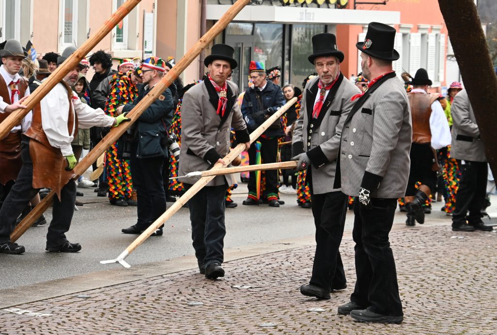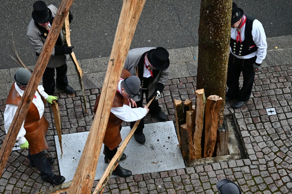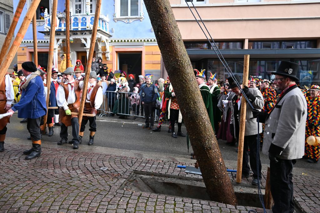 Wer die Ganze Zeit vor Ort geblieben ist, konnte verfolgen, dass das Narrenbaum-Stellen ein großer Kraftakt ist, der viele Hände braucht. Und Geduld. Die Zimmerer nutzen eine traditionelle Technik, bei der viele Helfer den Baum in kleinen Etappen immer weiter mit verschiedenen Stangen anheben.