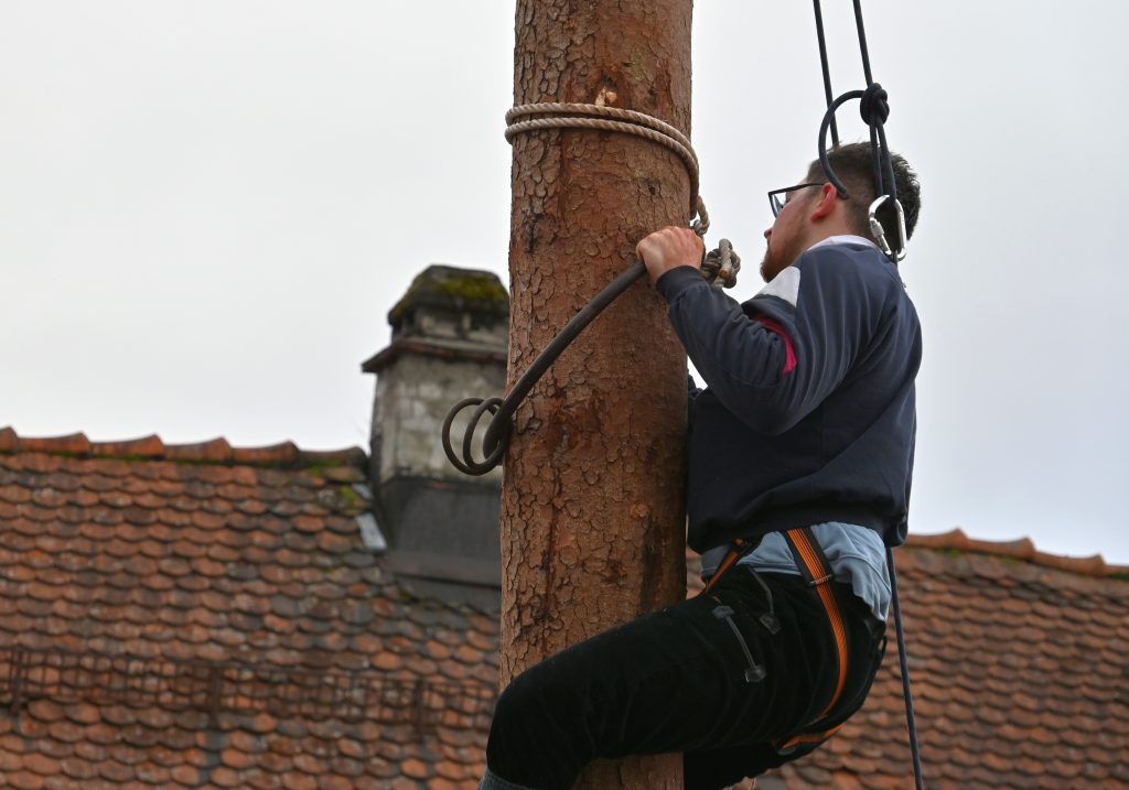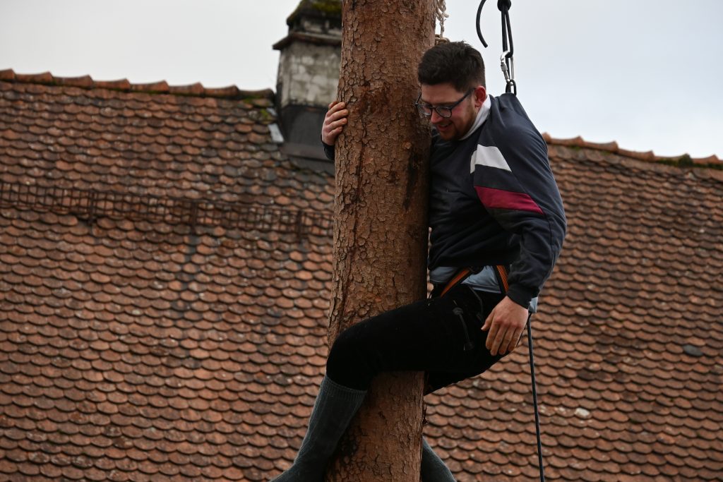 Als der Baum stand und befestigt war, hatte ein neuer Kletterbue seine Premiere, um den Sicherungsring in mehreren Metern Höhe zu lösen. Unter der Anfeuerung der Zuschauer schaffte er es und erhielt viel Applaus.