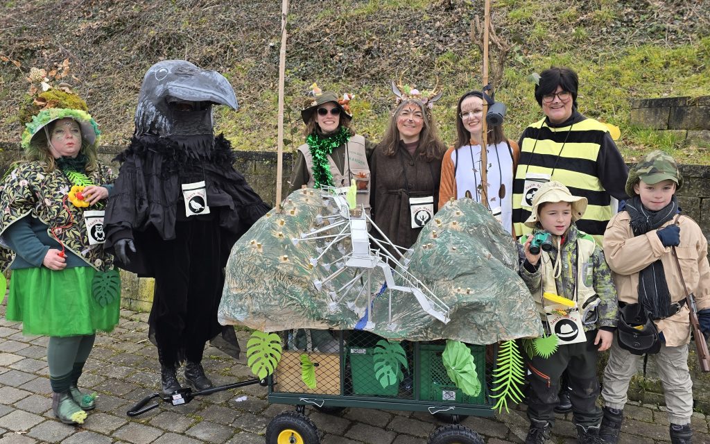 Auch ein Schlager, aber ganz lokal auf die Marienschlucht umgedichtet, gab es von der kleinen Theatergruppe des TSV Bodman. Karin Weber lief als geschützer Kolkrabe und zog einen Wagen mit einem Modell der Marienschlucht. Auf dem Steg stand dort eine Marienfigur mit gepacktem Koffer. Die anderen waren als Wald oder Wanderführer verkleidet und verteilten den neuen Liedtext von „Santa Maria“, den die Frauen später am Seeum zum Besten gaben.