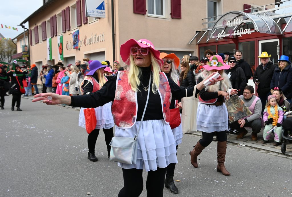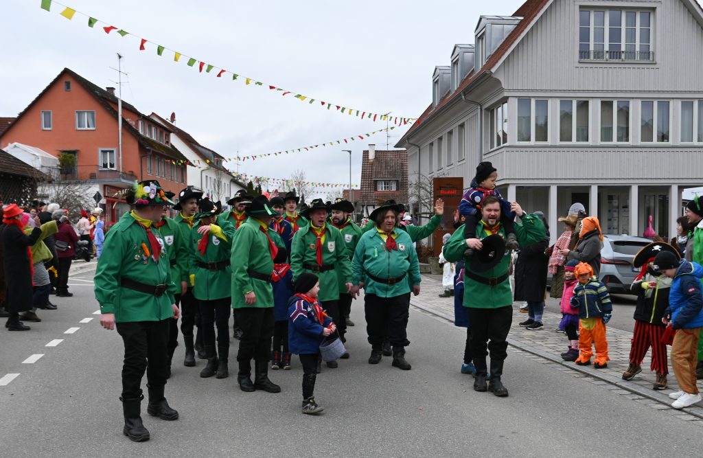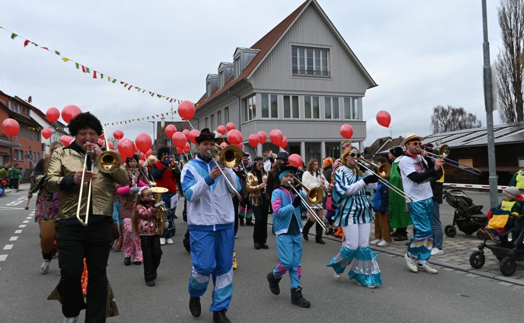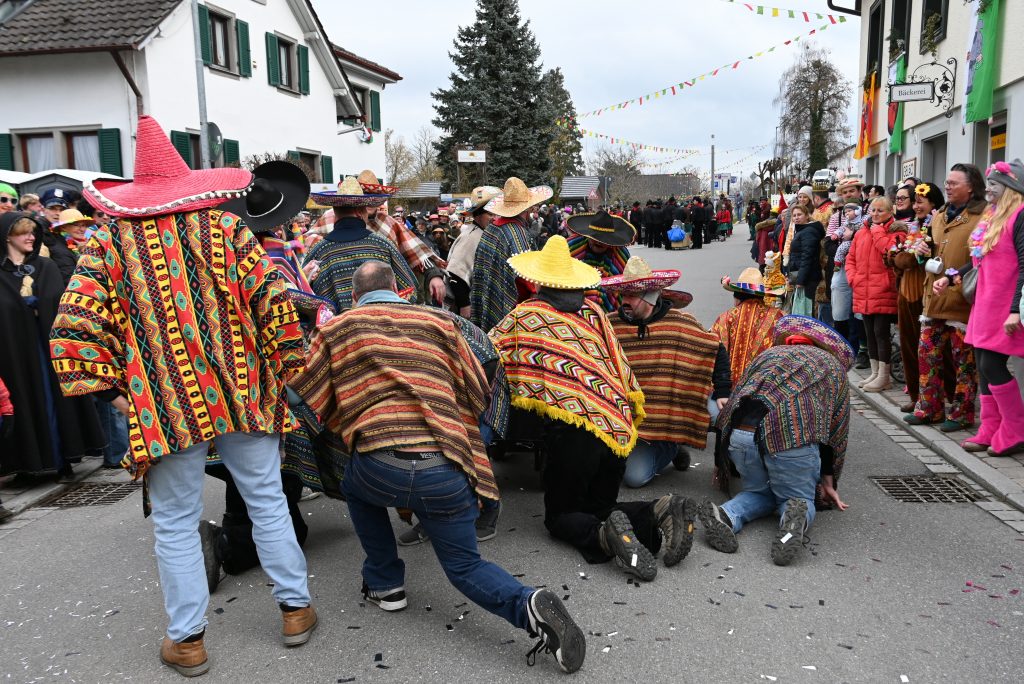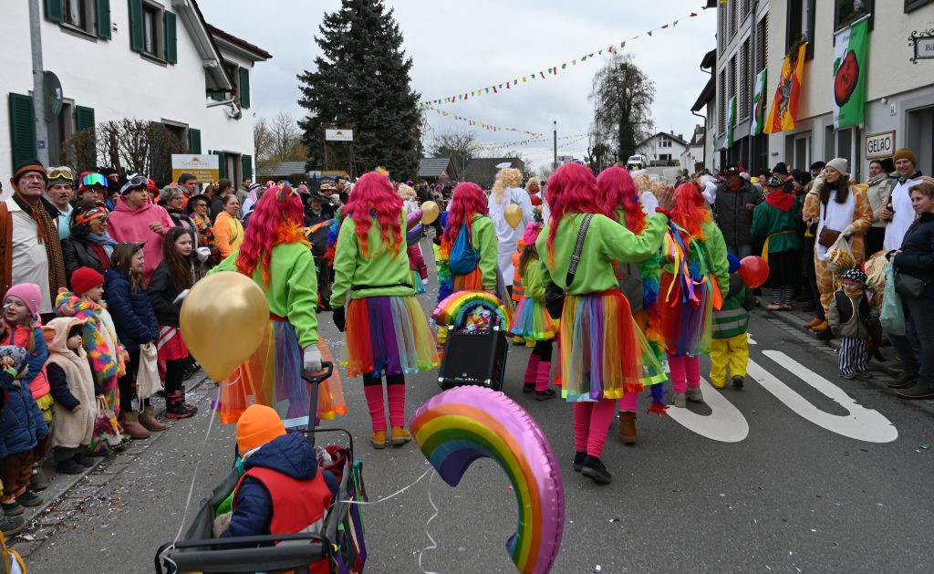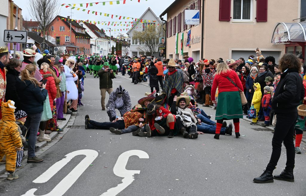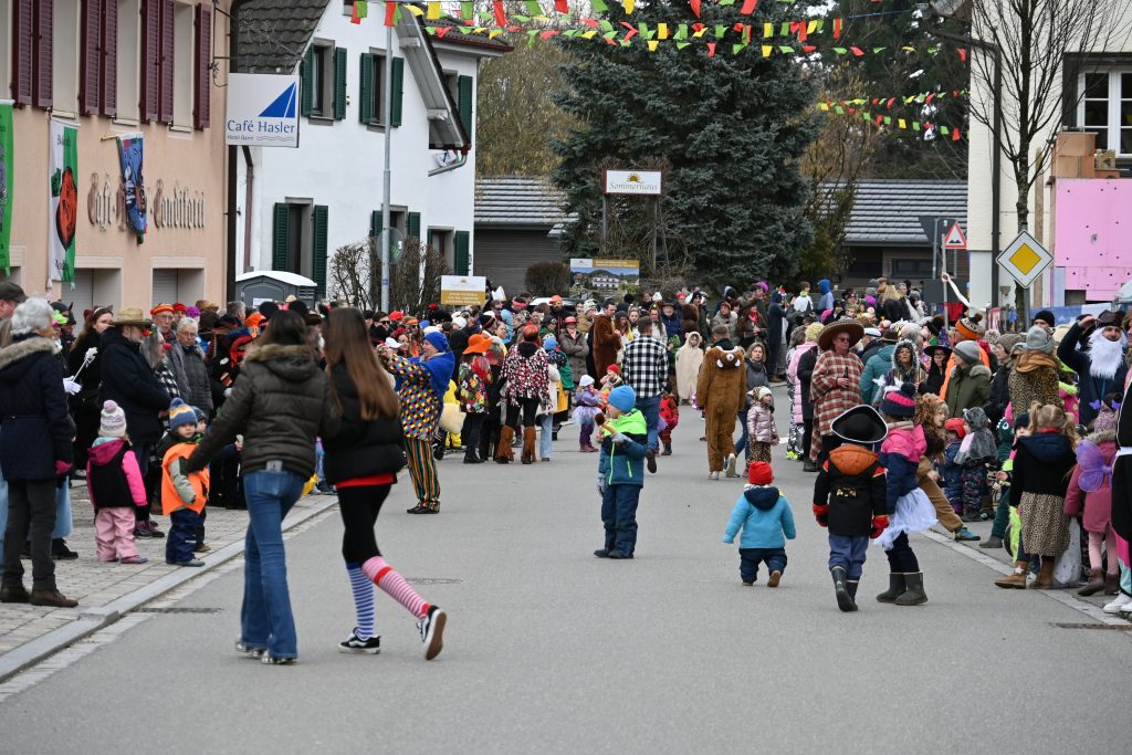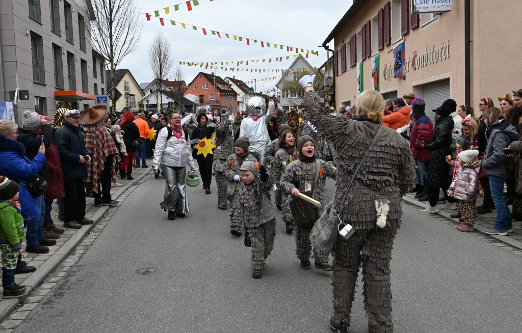 Der Umzugsweg verlief dieses Jahr übrigens etwas anders als sonst. Die Route führte einmal gerade aus durch den Ort – ebenerdig und ohne Kurven, einfach nur von der Weilerkapelle bis zum Seeum. Überall standen bunt verkleidete Zuschauer. Die meisten jubelten den Narren im Bereich beim Café Hasler zu.