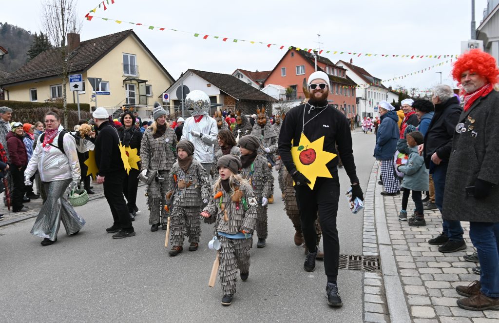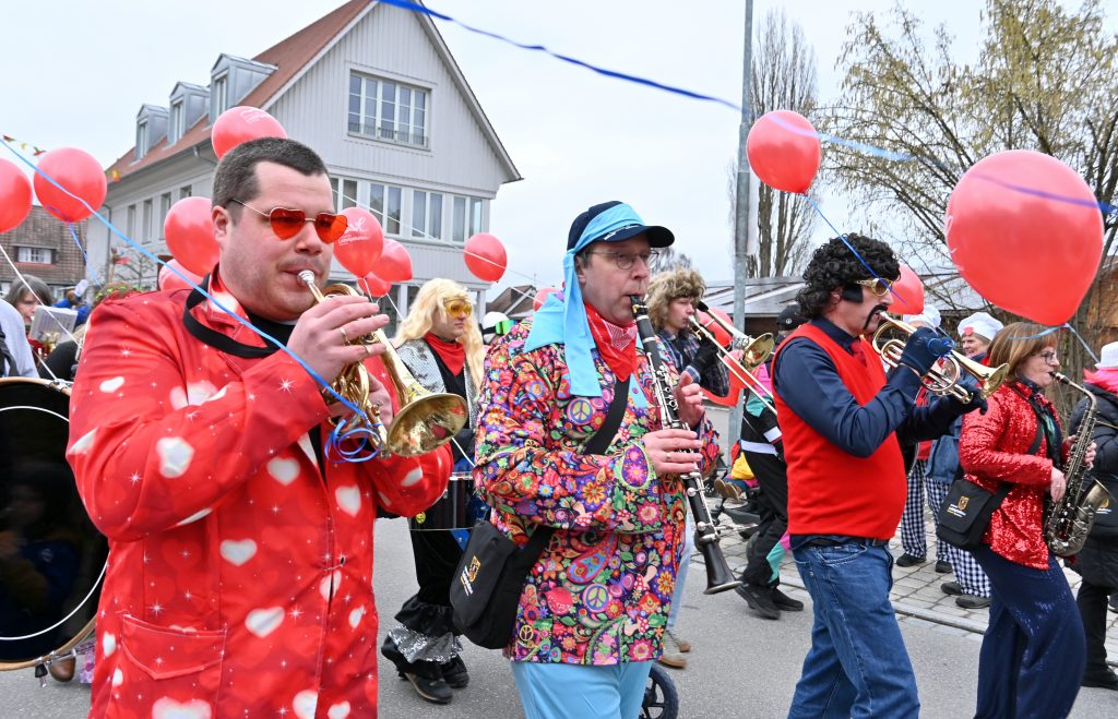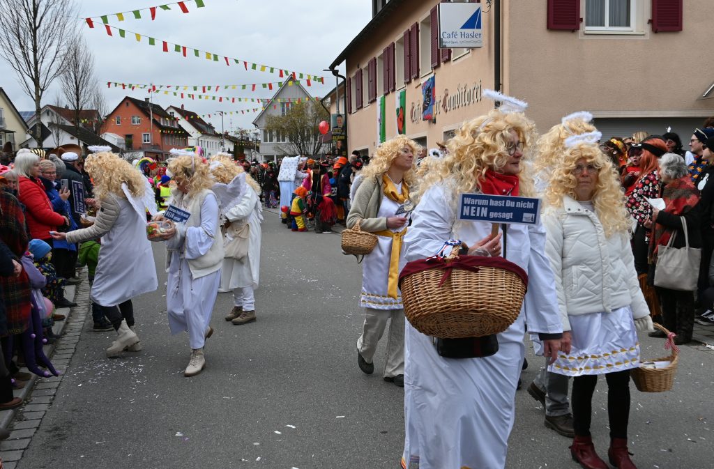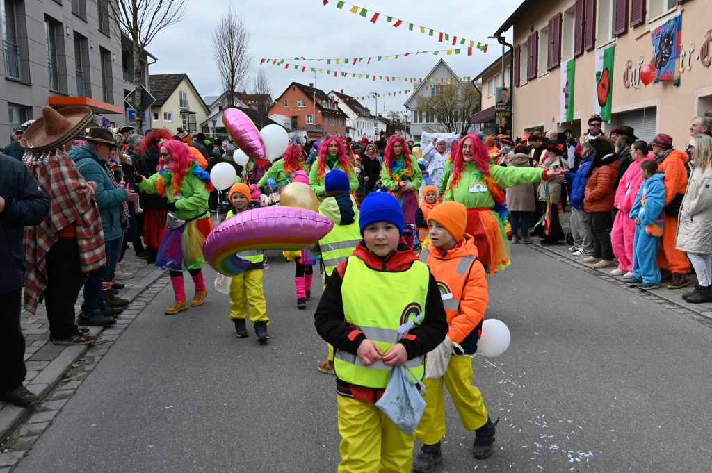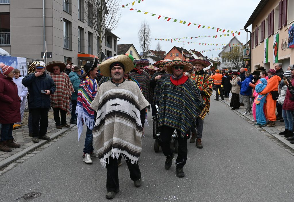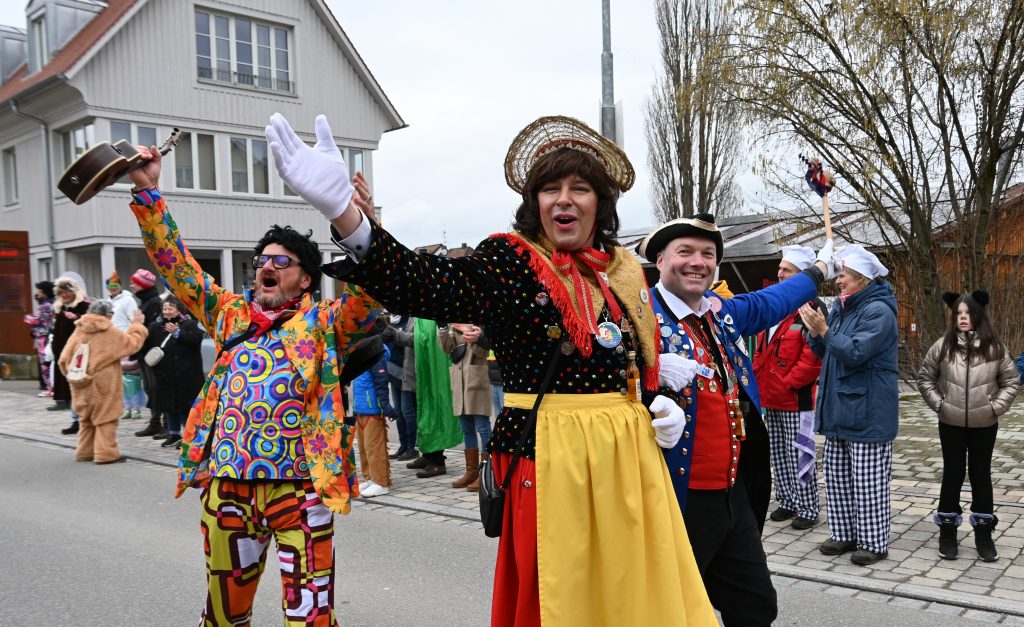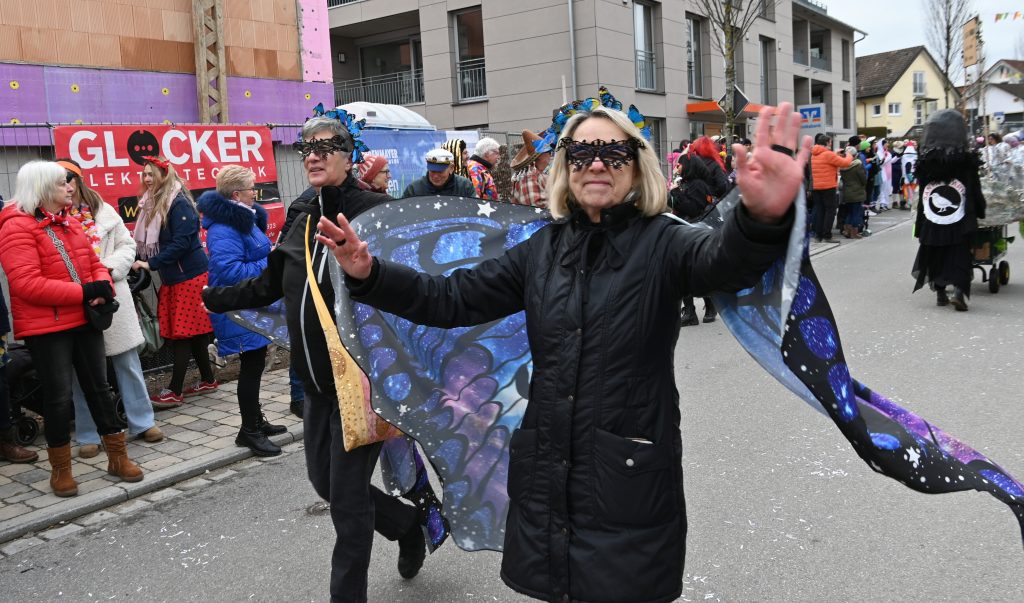 Der Umzugsweg verlief dieses Jahr übrigens etwas anders als sonst. Die Route führte einmal gerade aus durch den Ort – ebenerdig und ohne Kurven, einfach nur von der Weilerkapelle bis zum Seeum. Überall standen bunt verkleidete Zuschauer. Die meisten jubelten den Narren im Bereich beim Café Hasler zu.