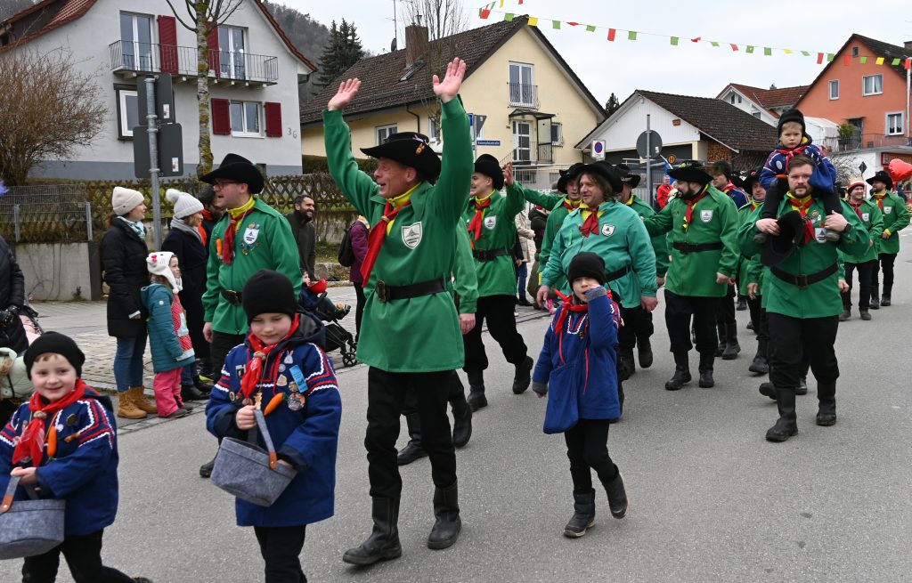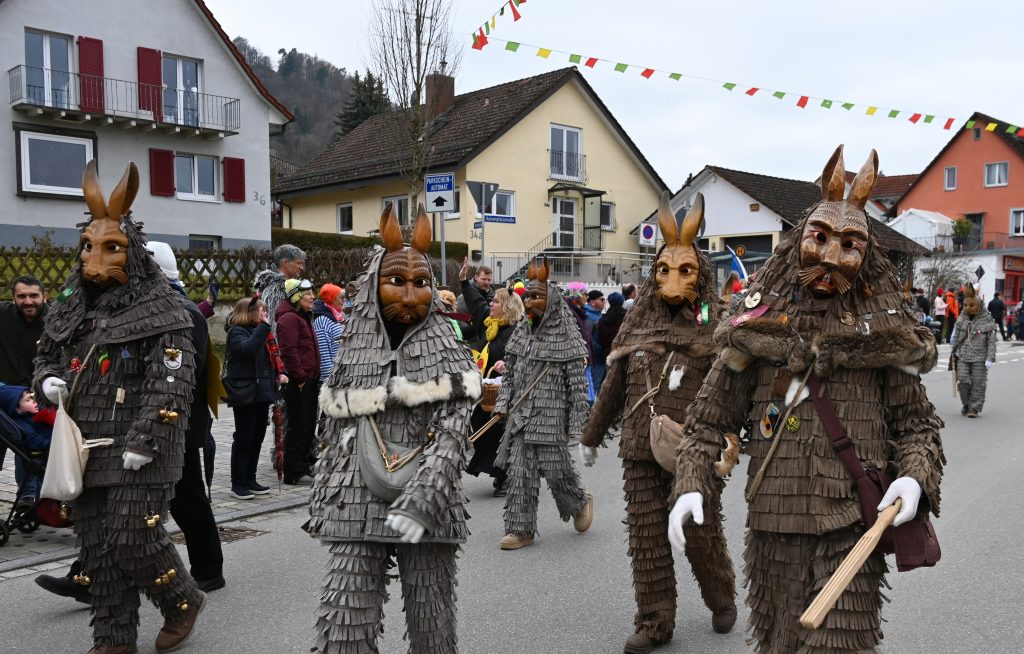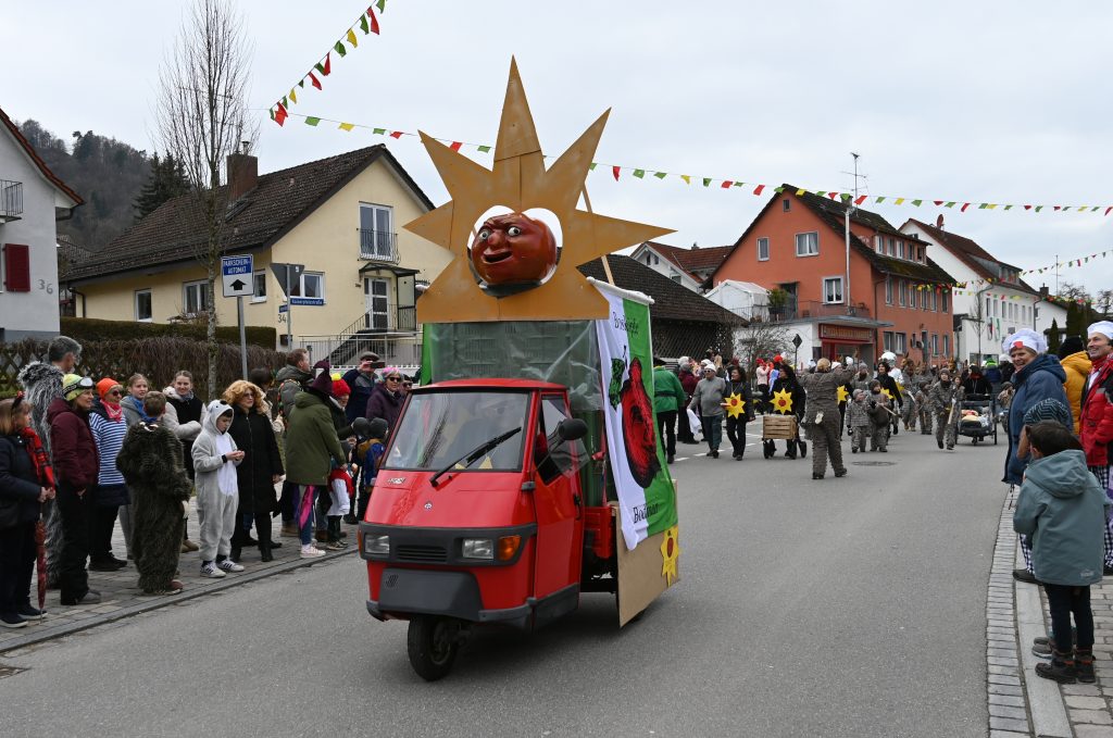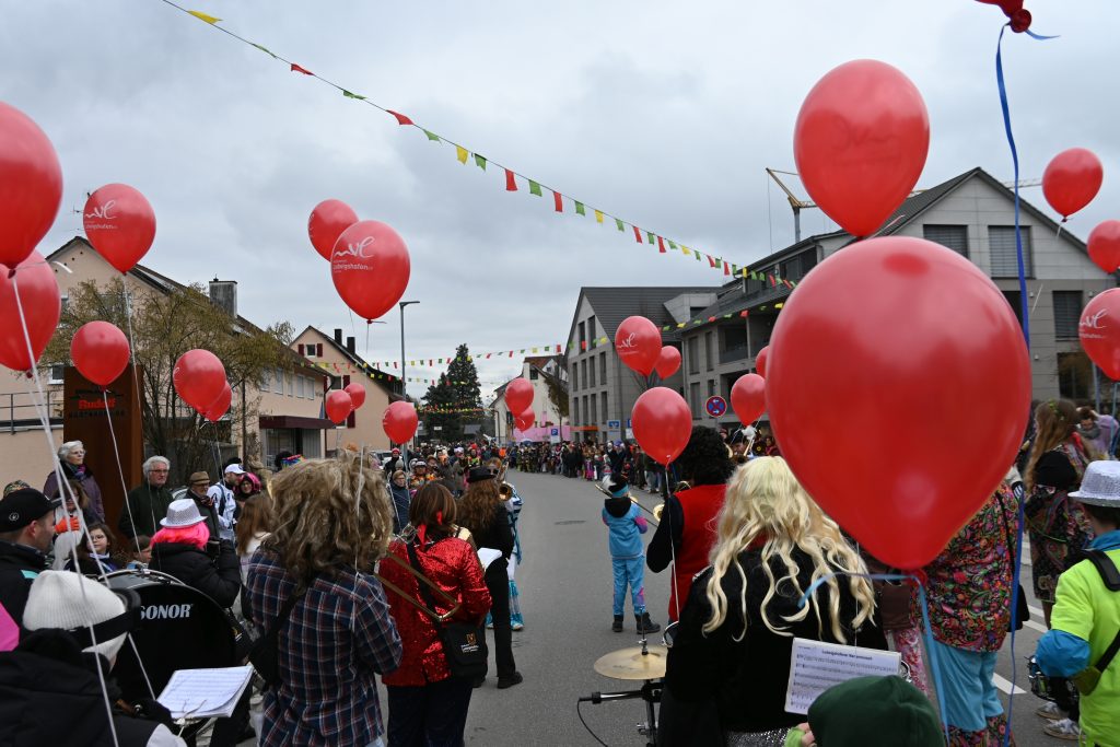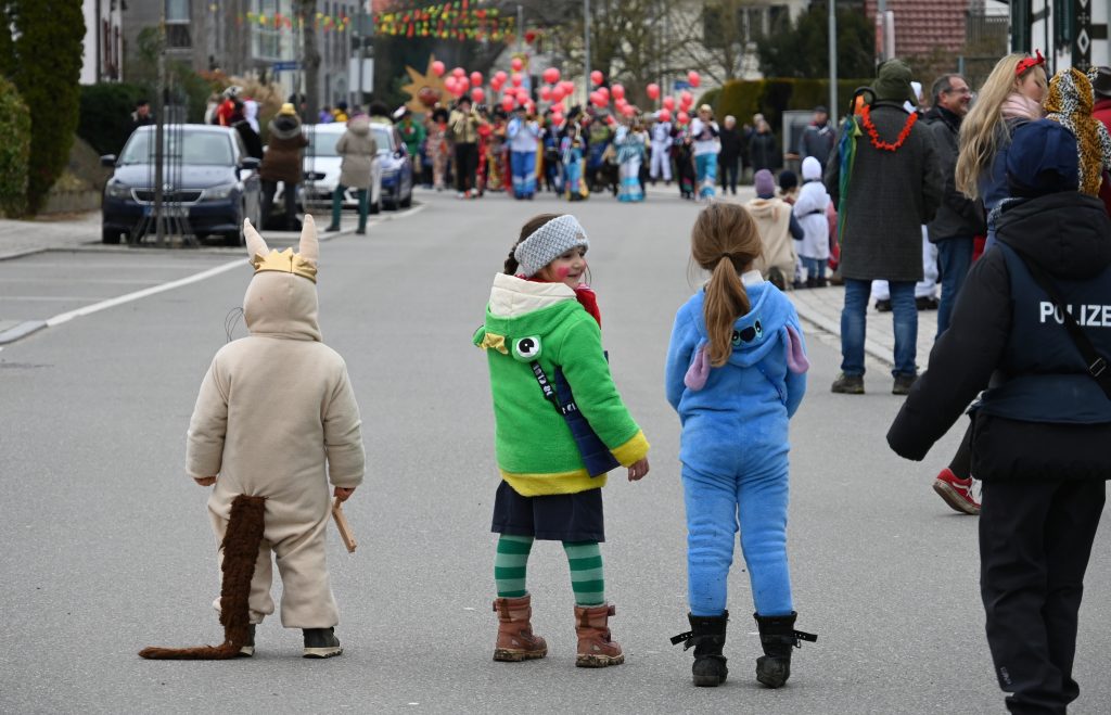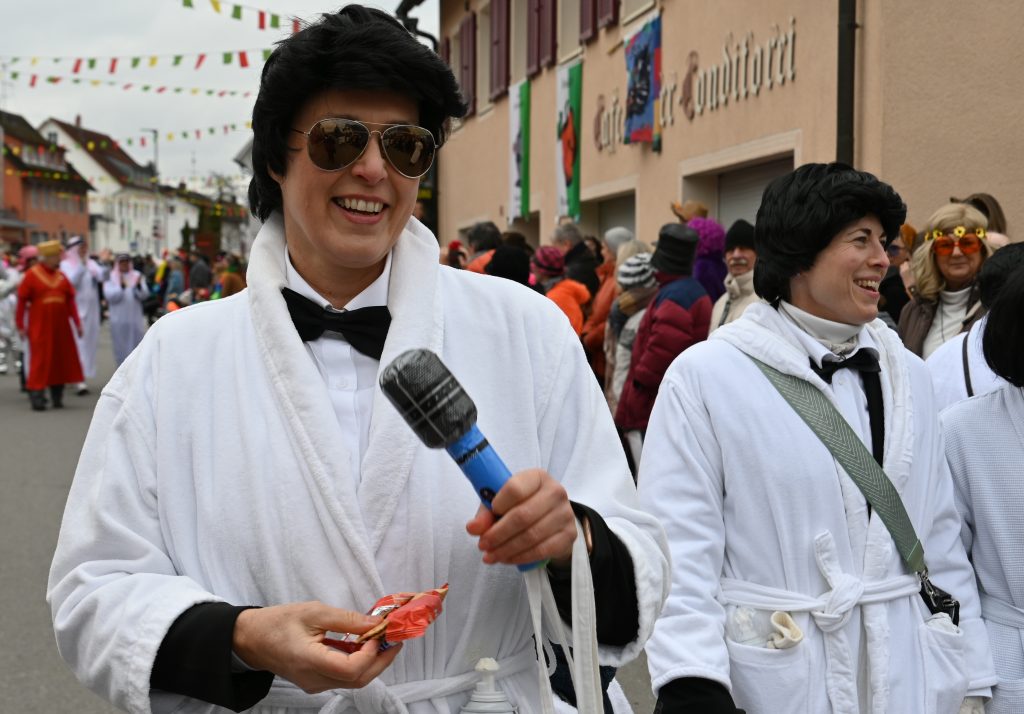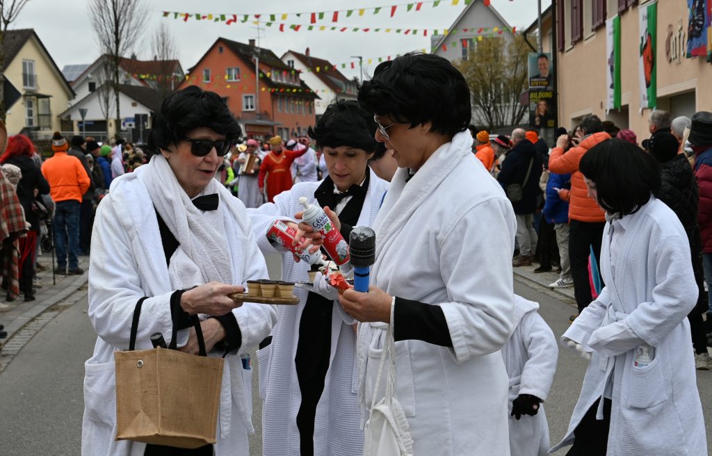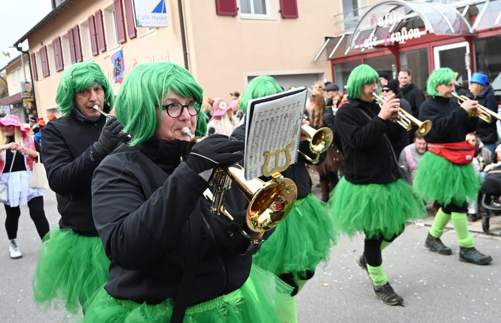Der Umzugsweg verlief dieses Jahr übrigens etwas anders als sonst. Die Route führte einmal gerade aus durch den Ort – ebenerdig und ohne Kurven, einfach nur von der Weilerkapelle bis zum Seeum. Überall standen bunt verkleidete Zuschauer. Die meisten jubelten den Narren im Bereich beim Café Hasler zu.