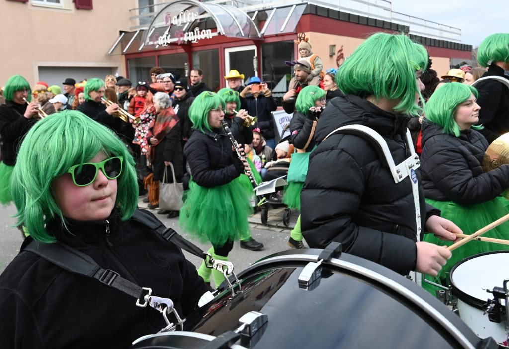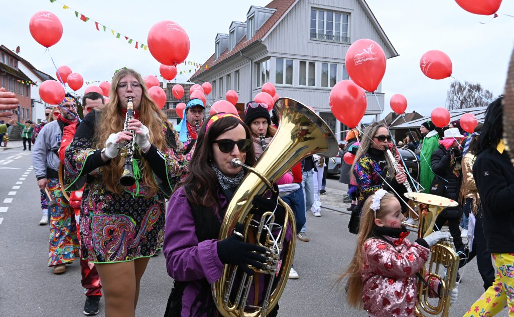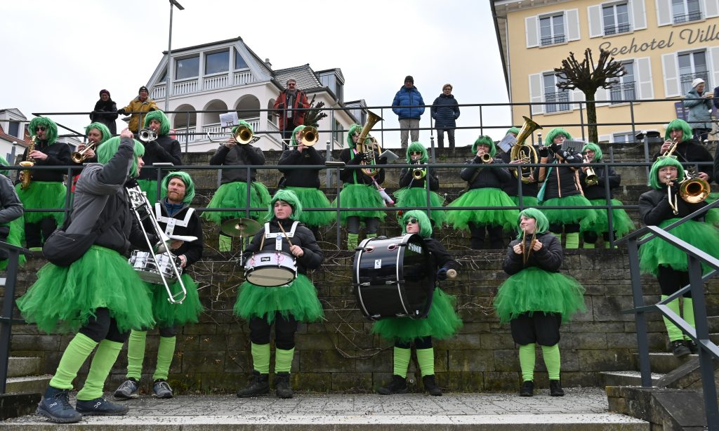 Der Musikverein Ludwigshafen, der den Umzug anführte, ging voll im Motto auf – da traf die traditionelle Musik auf die bunten Kostüme zum Thema Schlager. Die Musikkapelle Bodman marschierte in grünen Tütüs und grünen Perrücken statt ihrer üblichen Tracht.