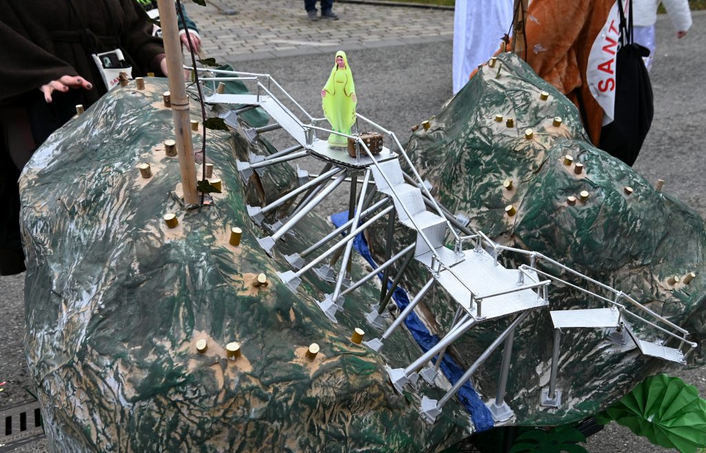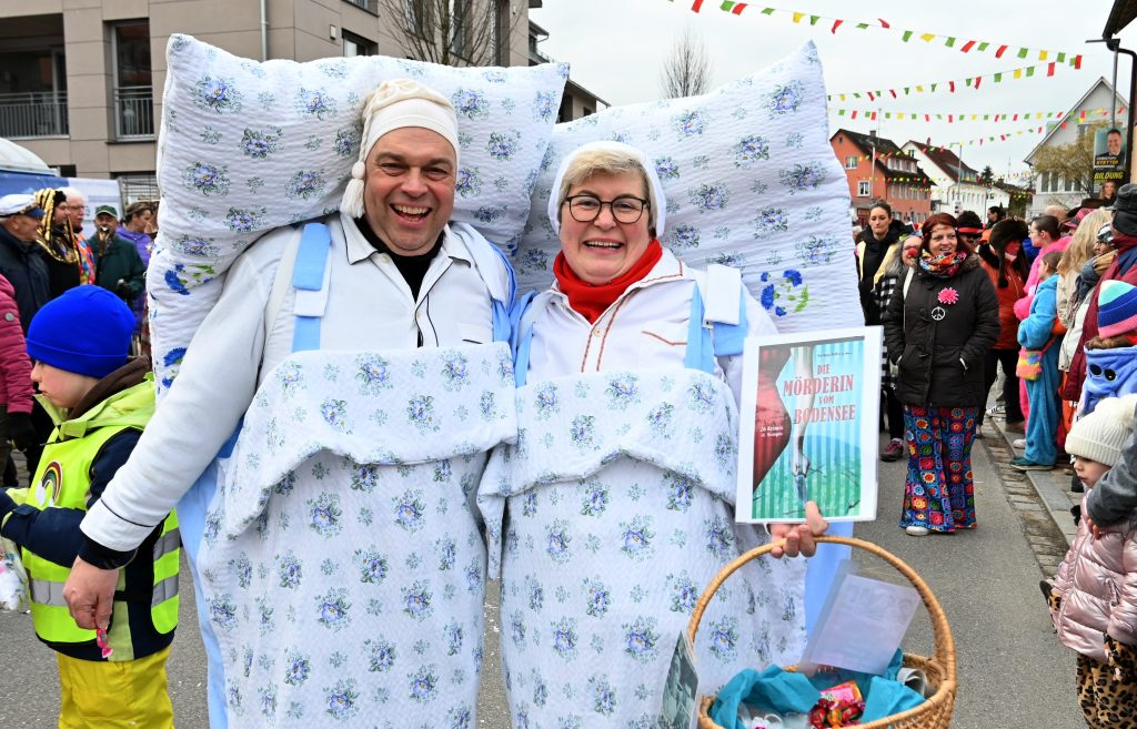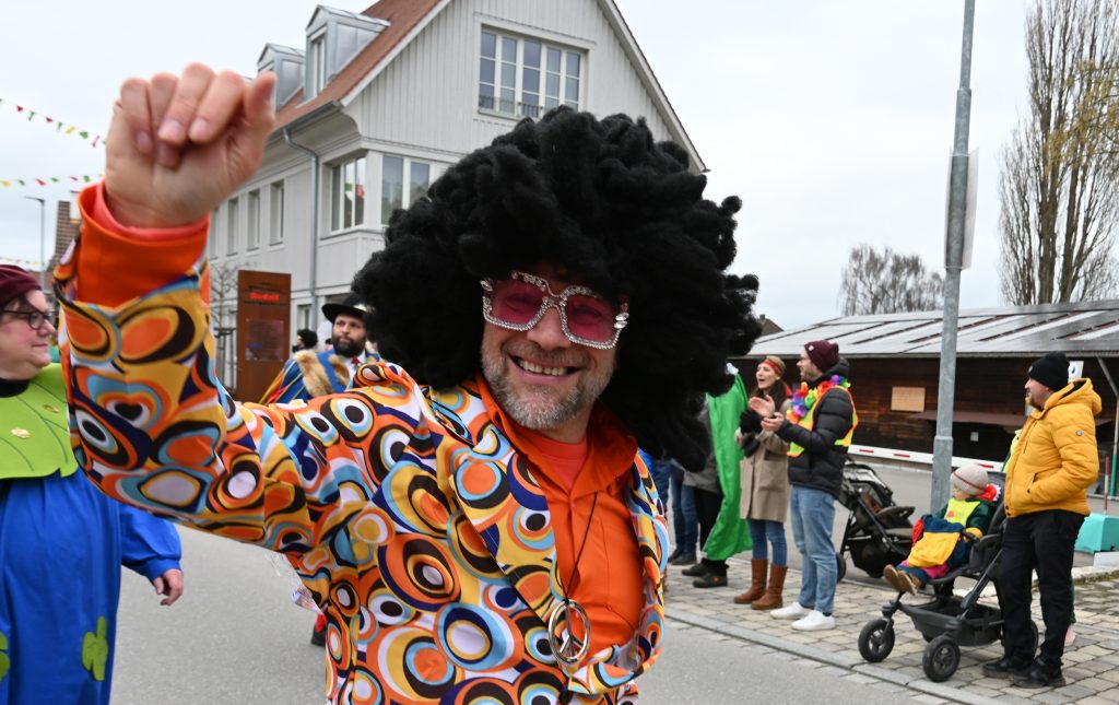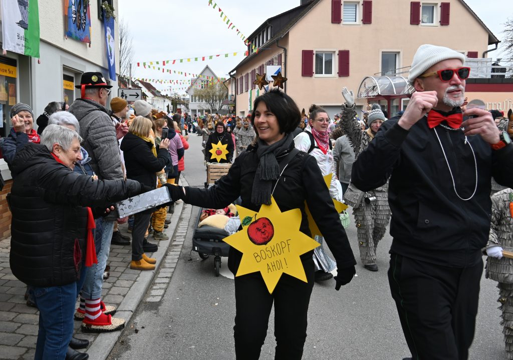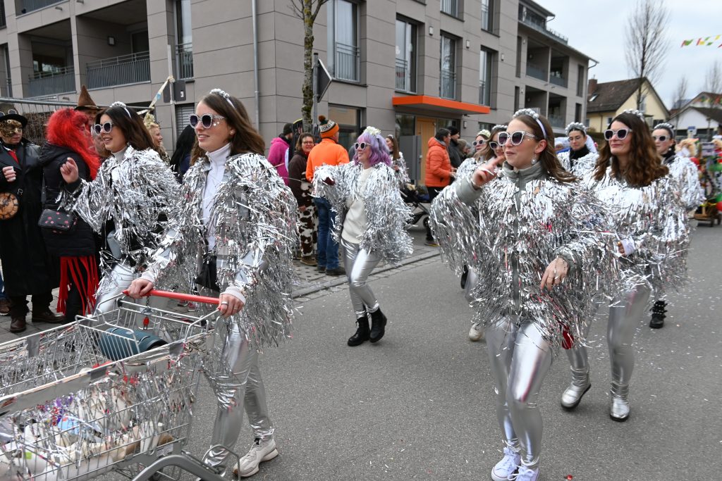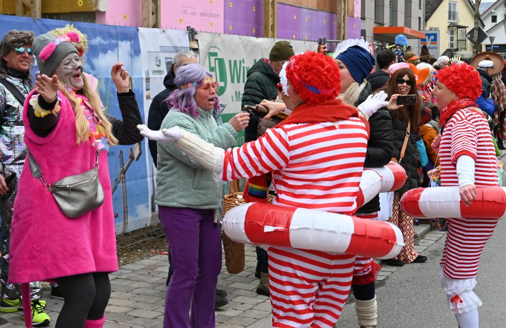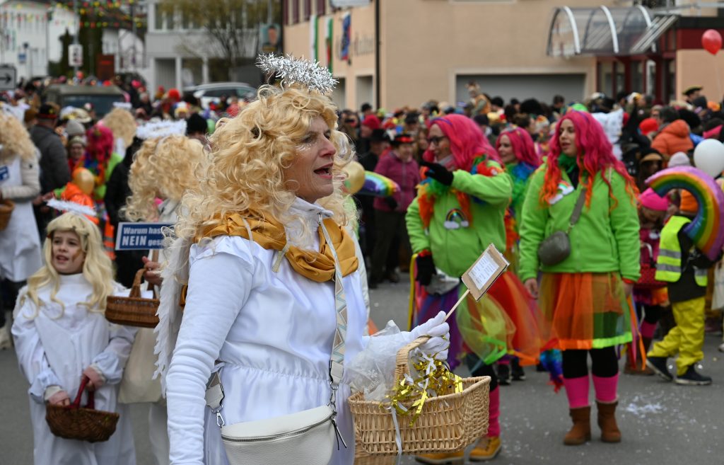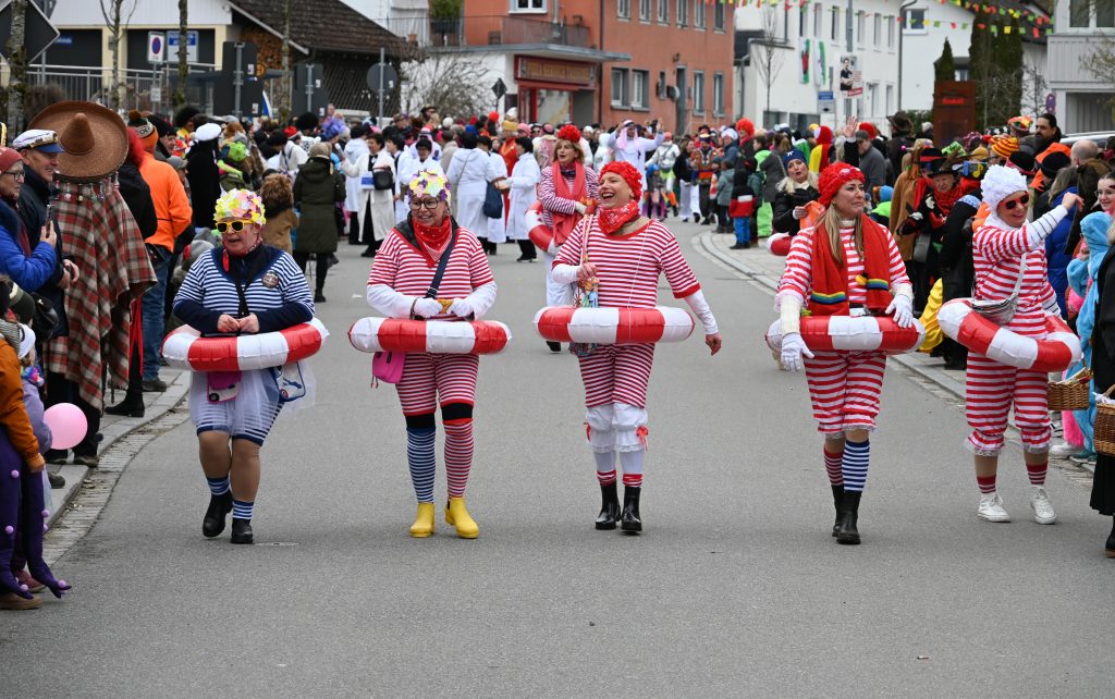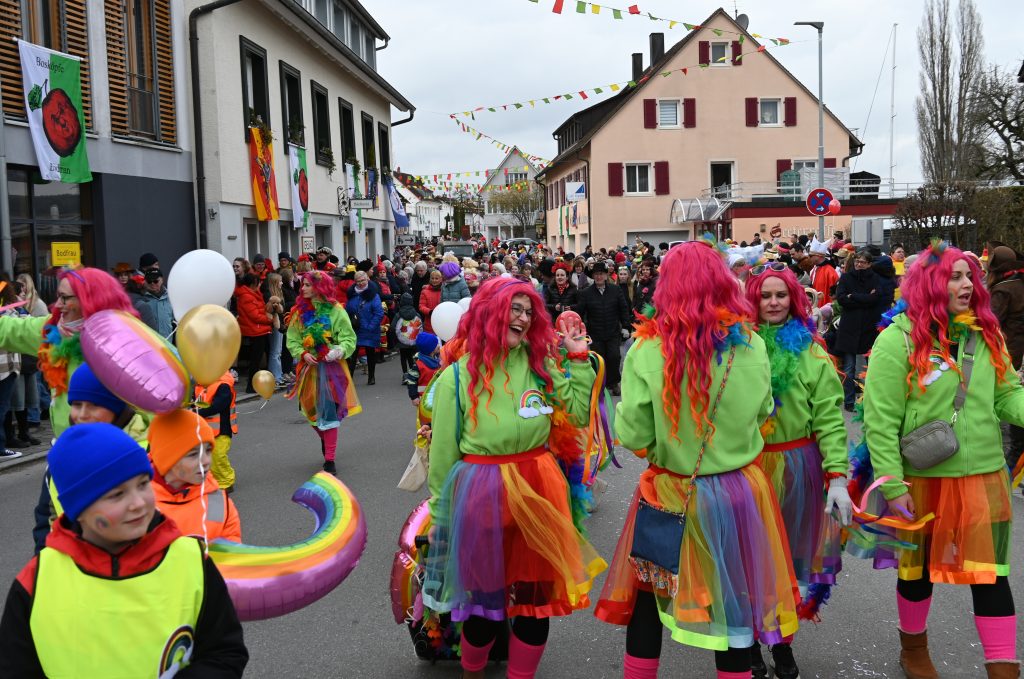 Eine Gruppe aus Kindern und Erwachsenen wirbelte als bunte Regenbogen mit und die Apfelblüten aus Bodman tanzten in silbernen Kostümen über die Straße. Eine weitere Frauengruppe hatte Rettungsringe um die Taillen und sangen den Schlager „Er hat ein knallrotes Gummiboot“. Eine andere Gruppe verkörperte das Lied „Schatzi, schenk mir ein Foto“ und mehrere Engel schwebten zu „Warum hast du nicht nein gesagt“ durch die Straße.