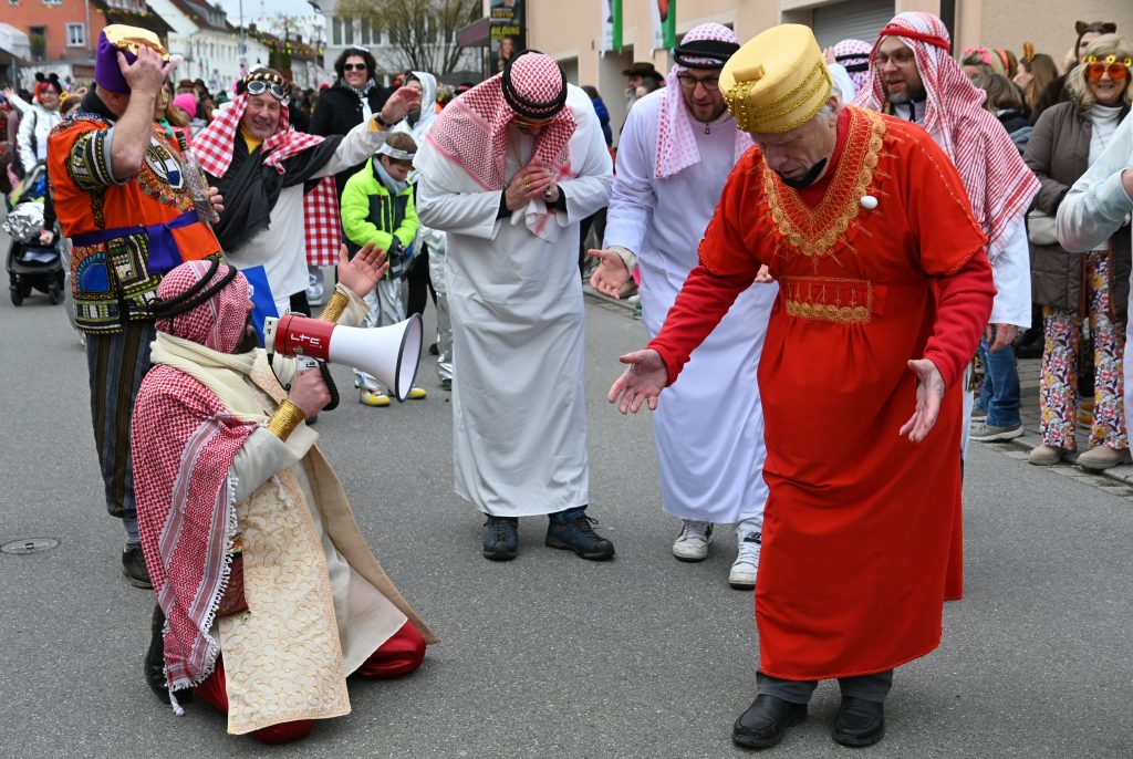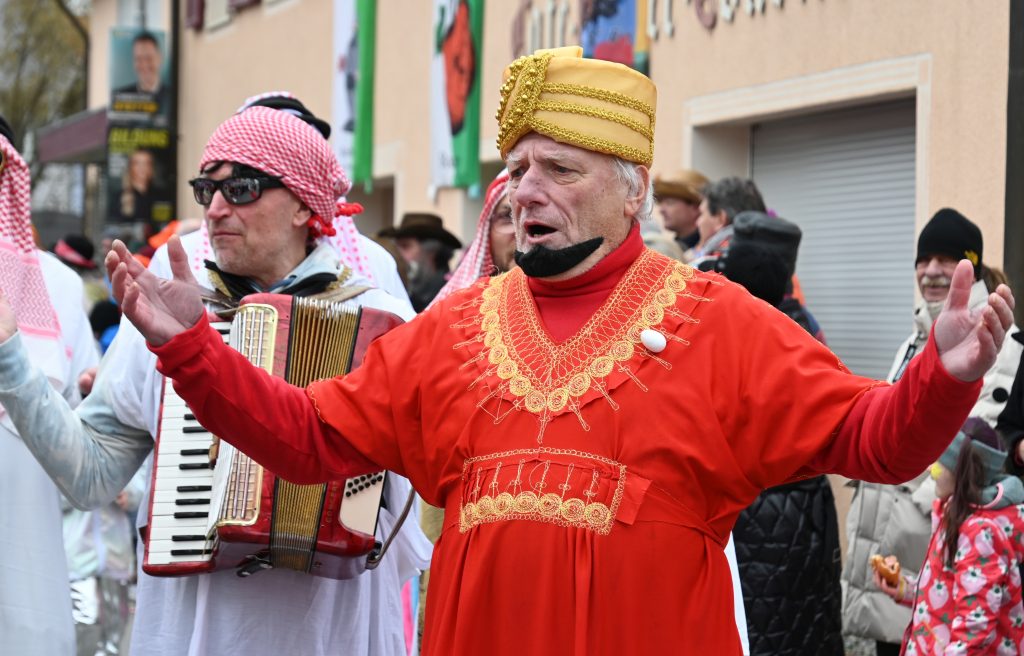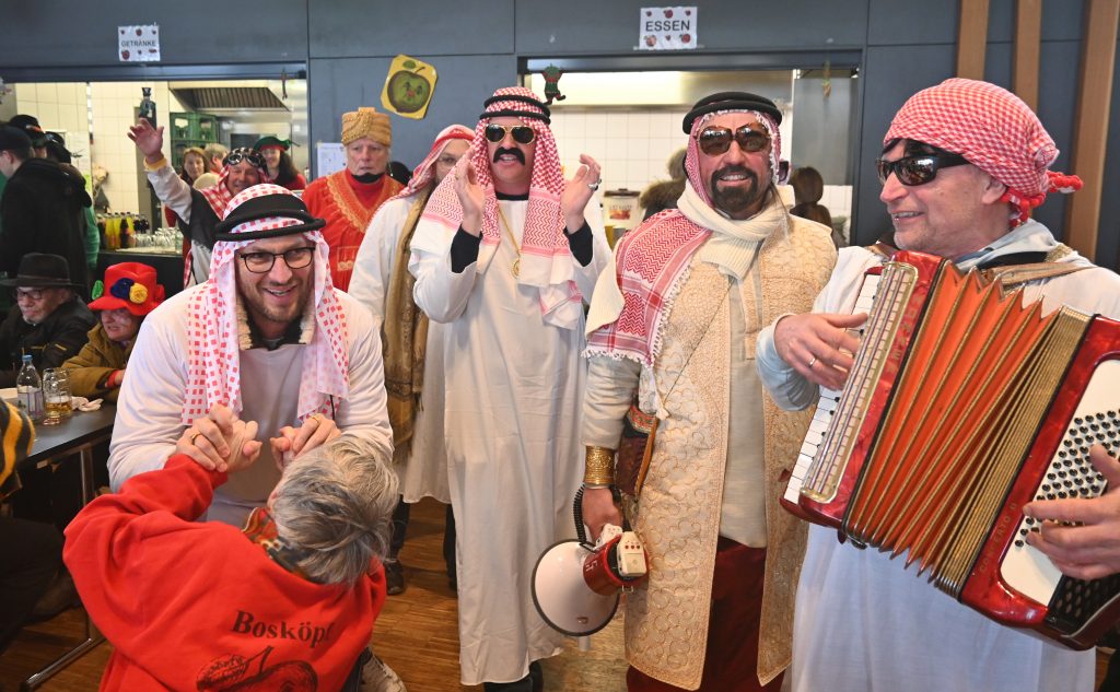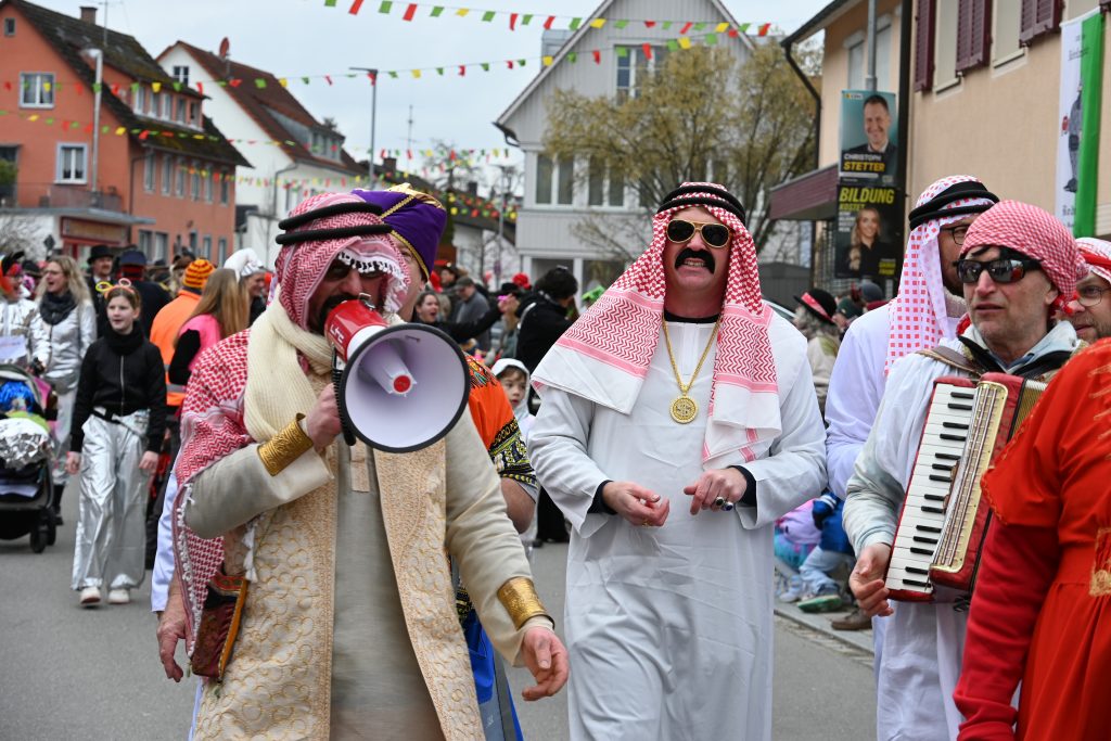 Exotisch wurde es bei einer Männer-Gruppe, die als singende Scheiche unterwegs waren, und direkt im Anschluss an den Umzug im Seeum für Stimmung sorgten. Der Saal dort war ruckzuck voll und an den Theken für Essen, Kuchen und Getränke war viel los. Doch auch draußen im Zelt und beim Café Hasler feierten die Narren, während sich sogar noch die Sonne zeigte.