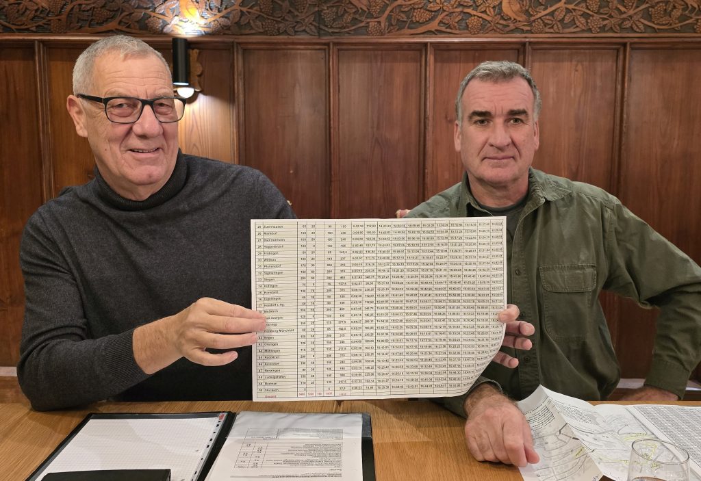 Martin Bosch (links) und Thomas Burgbacher zeigen die Tabelle für den Umzug – genauergesagt: Eine Seite davon. 50 Zünfte müssen irgendwie koordiniert werden. Bild: Ramona Löffler