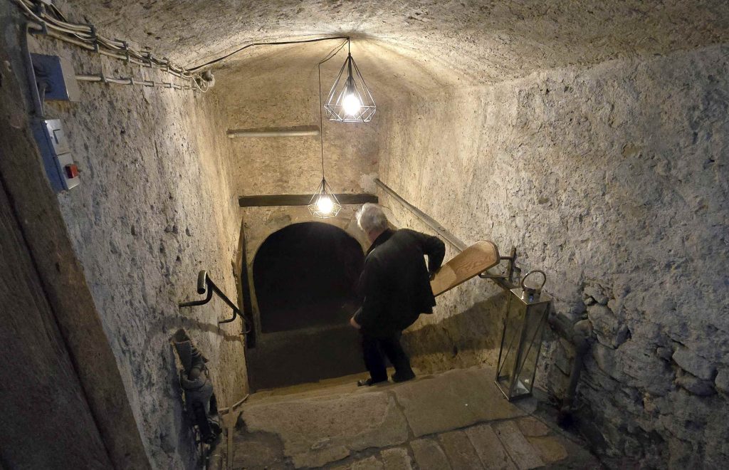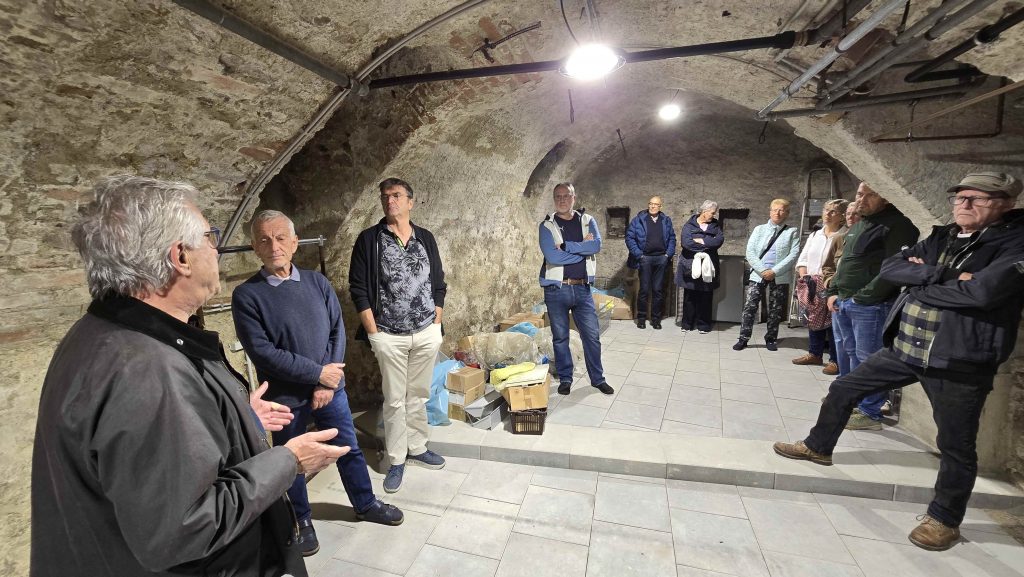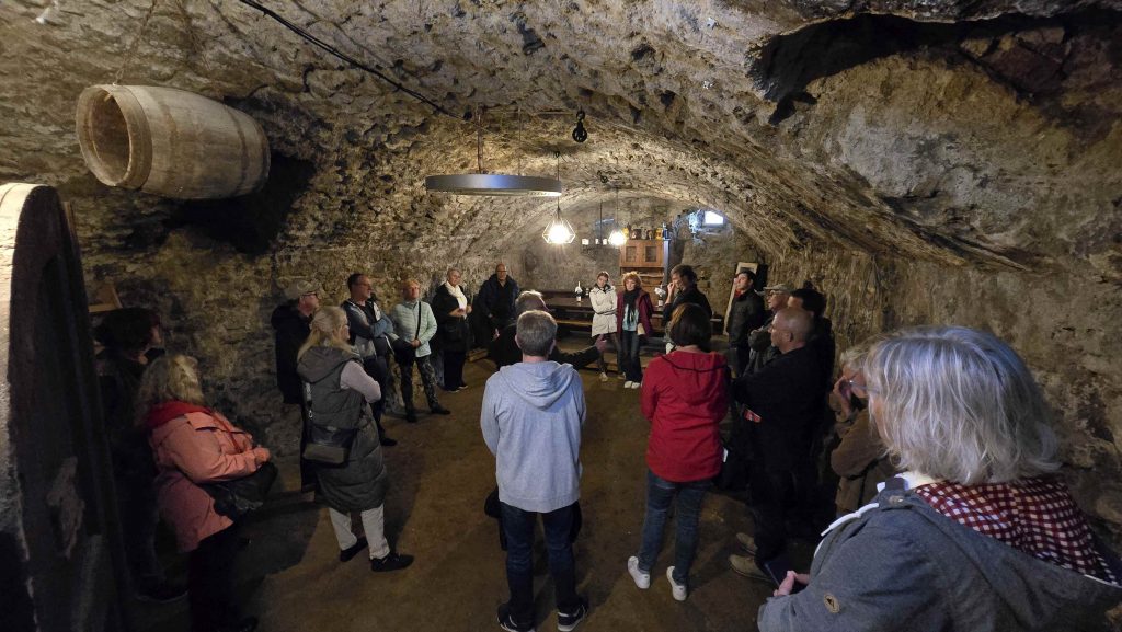 Die Weinflaschen bleiben im Nebenraum unter Verschluss, aber die Informationen strömen. Laut Warndorf dürfte dieser Keller von etwa 1350 der älteste der Stadt sein und einer reichen Person gehört haben. Die Bauweise deute darauf hin – die Steine seien sehr sorgsam verarbeitet und an ein paar Stellen gebe es Indizien, dass es neben dem Gebäude einmal Brandschutzgassen gegeben habe – soetwas hätten nur herrschaftliche Häuser gehabt.