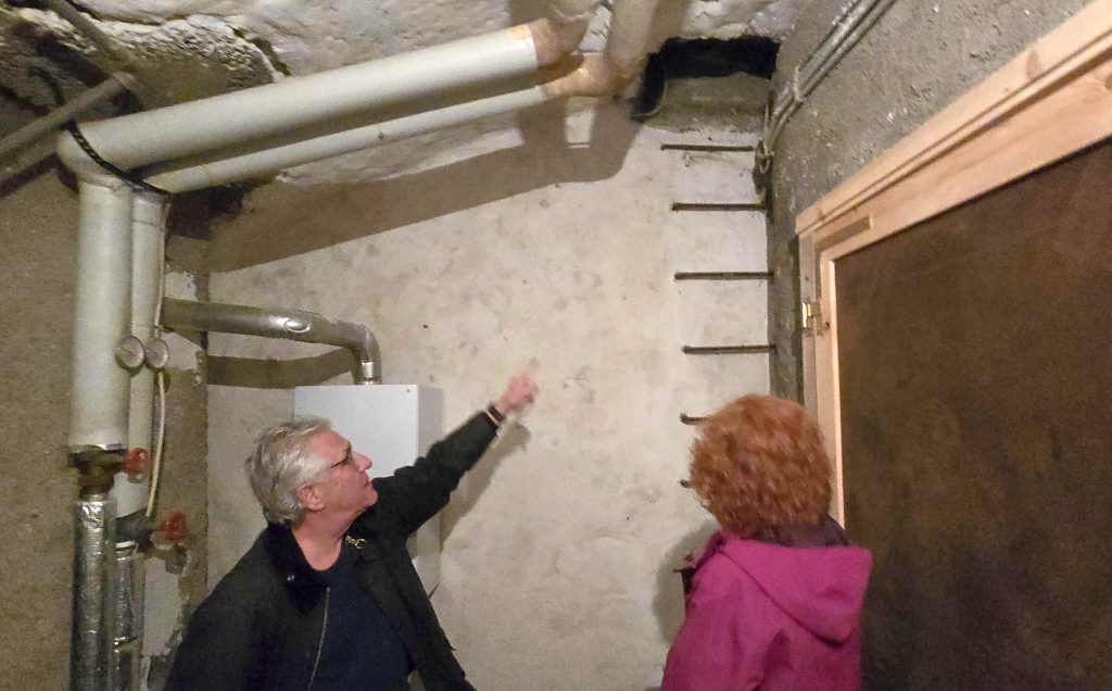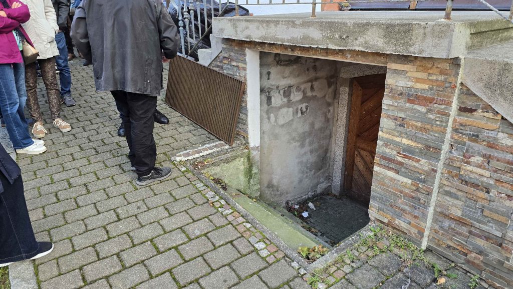 Überhaupt sei es eine schwierige und wilde Zeit gewesen. Manche hätten kein Geld gehabt und teilweise hätten mehrere Familien in einem mit Holzbohlen abgedeckten kleinen Keller gehaust, bis der Aufbau irgendwann wieder möglich gewesen sei. Zu Ausbesserungen in den Kellerwänden seien Materialien aus den Trümmern verwendet worden. Warndorf konnte in später im dritten Keller genau so eine Stelle zeigen und beschrieb, wie in manchen Kellern rötliche Färbungen an Steinen ein Hinweis seien, dass diese mit Flammen in Kontakt gekommen seien.