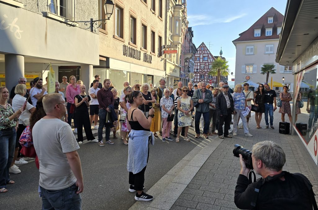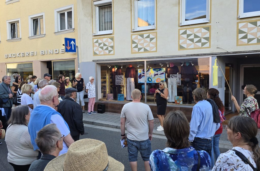 Dies ist übrigens die vierte Auflage der Kulturnacht bzw. Kunstmeile. Susen Katter hob in ihrer Begrüßung hervor, dass die Kunst dieses Mal in der gesamten Innenstadt zu finden sei, nicht nur in der Oberstadt. Die Kunst in den Schaufenstern sei eine Einladung, miteinander ins Gespräch zu kommen. „Das soll auch ein Ort der Begegnung sein. Mir ist es ganz, ganz wichtig, dass wir die Innenstadt auch als Begegnungsort erleben“, sagte sie und gab bereits einen Ausblick auf den 10. Oktober, wenn die Bürger eingeladen sind, sich daran zu beteiligen, wie das Honold-Haus gegenüber der Adler Post zu einer Begegungsstätte werden kann. Die Stadt hat das Gebäude vor einiger Zeit gekauft und möchte ein Haus der Begegnung daraus machen.