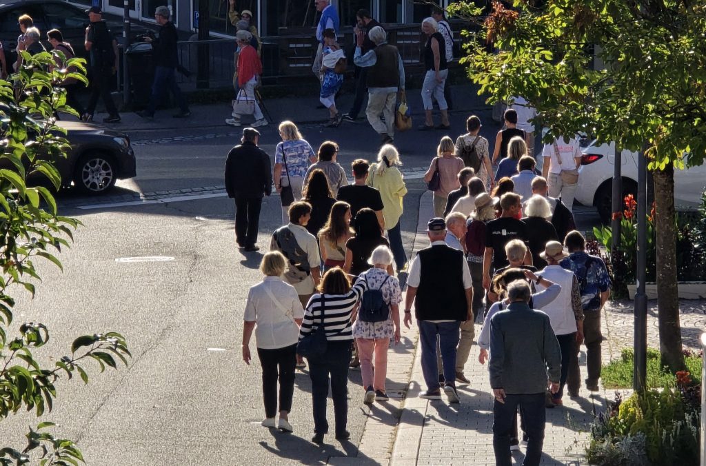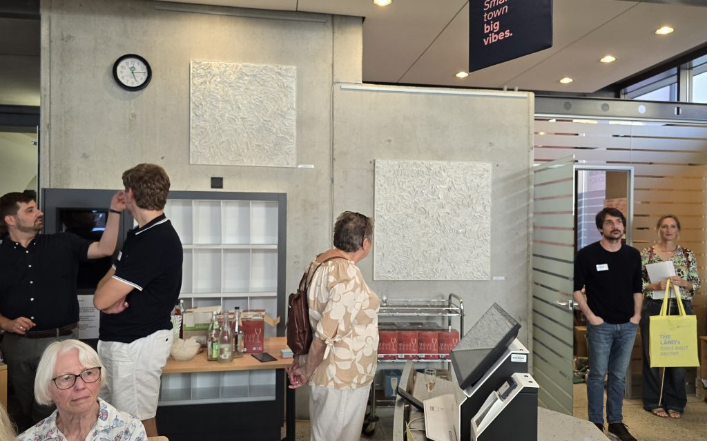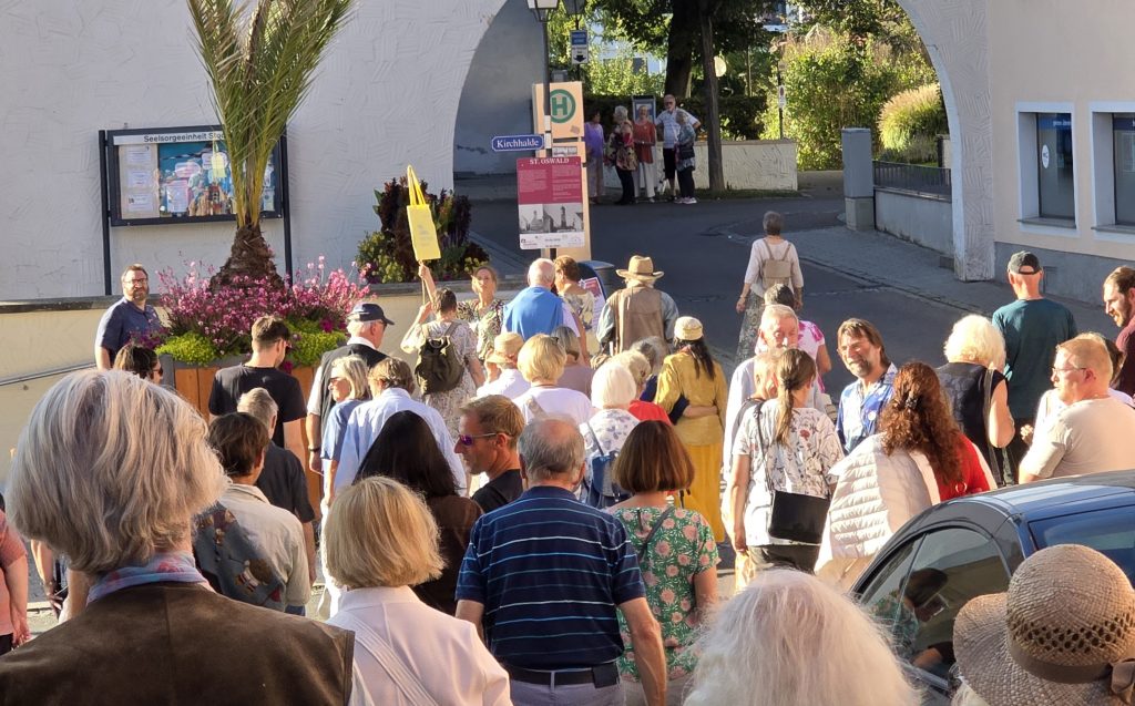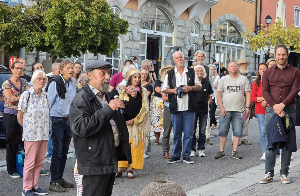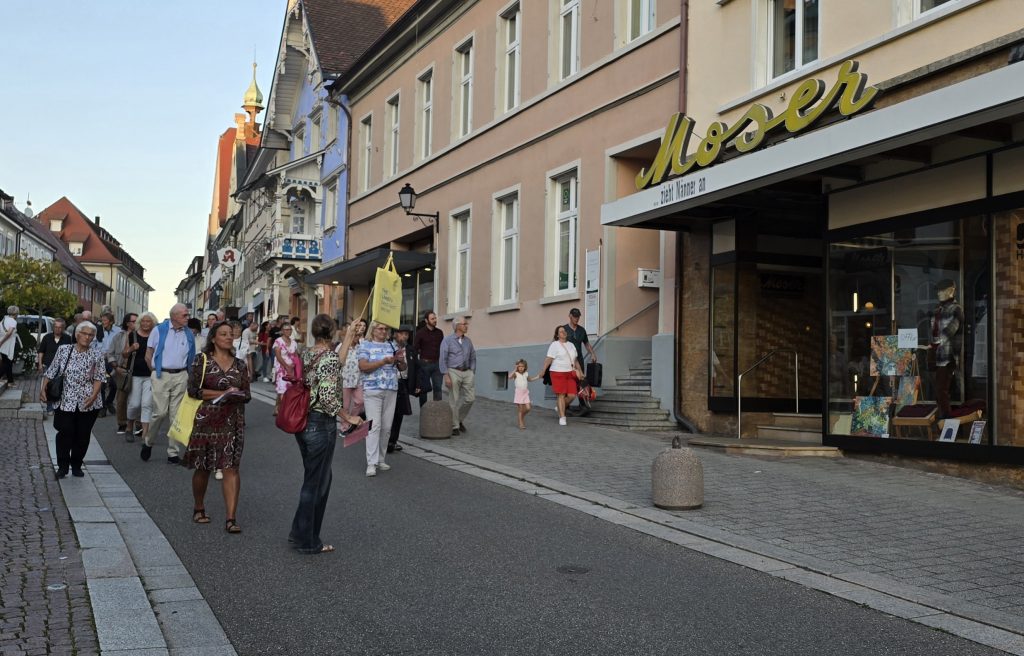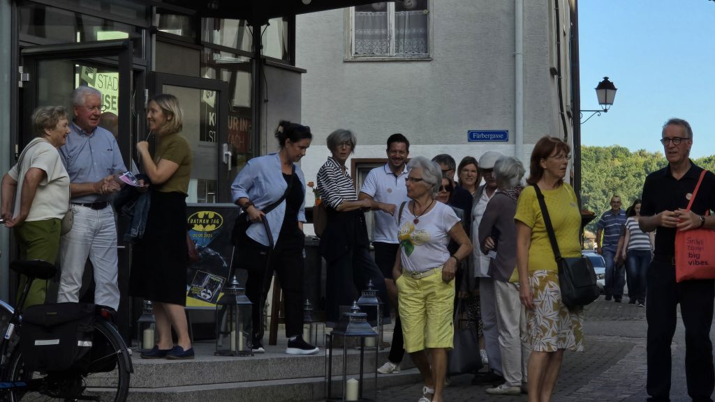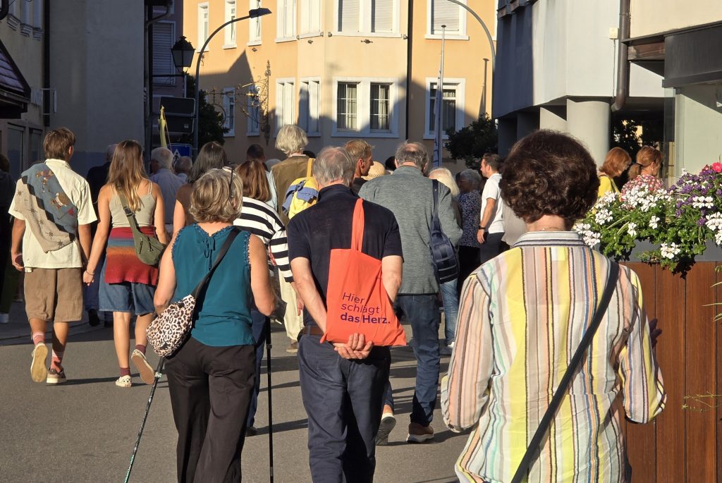 Da der Rundgang über die Kunstmeile in Ober- und Unterstadt rund 45 Minuten länger als eigentlich geplant ging, dünnte sich die etwa 50 Personen große Gruppe der Kunstinteressierten in den insgesamt fast zwei Stunden etwas aus. Als der Rundgang in die Vernissage von Ramona Löffler mündete, waren noch rund 30 Leute da.