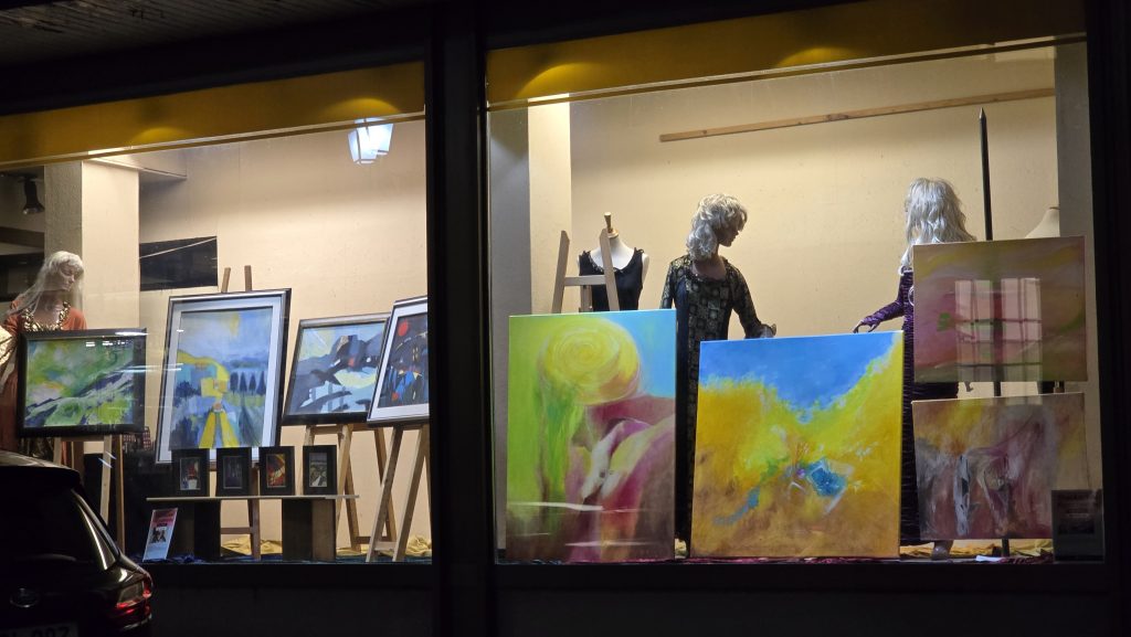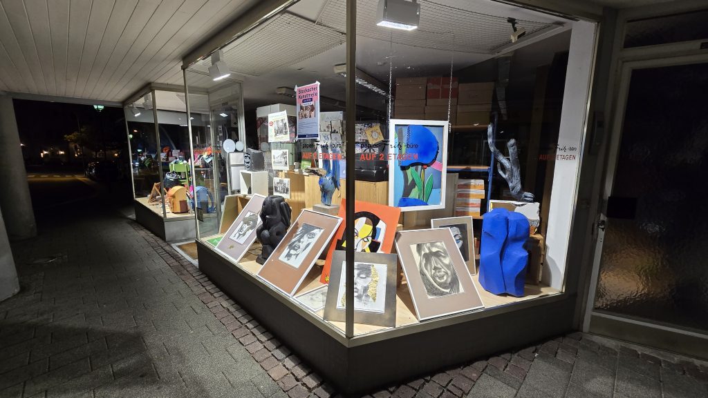 Außerdem ist eine Schaufenster-Schau schon länger da und bleibt noch auf unbestimmte Zeit: Die Ausstellung „Vater, Tochter, Kunst“ (Ramona Löffler und der verstorbene Bruno Löffler) ist bereits seit Oktober 2024 eine Dauerausstellung mit sehr positiver Resonanz und manchmal wechselnden Werken in den Schaufenstern des ehemaligen Schuhhauses Kramer.