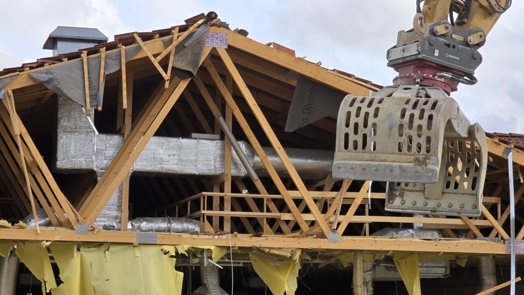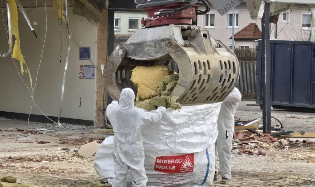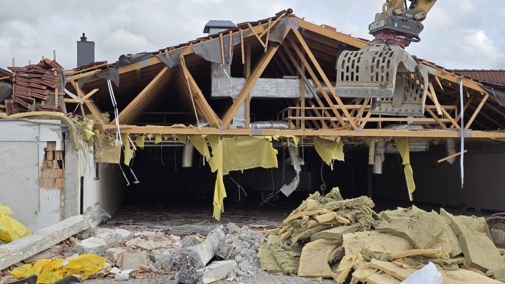 Immer wieder bleiben Passanten stehen und schauen zu, wie der Bagger arbeitet. Dabei sieht man, dass der Baggerfahrer sehr routiniert ist. Mit dem Zangen-Aufsatz sortiert er Holz, Metall, Dämmwolle und mehr. Das wirkt bei ihm komplett mühelos und ist faszinierend mitanzuschauen.