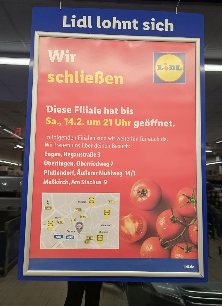 Auf dem Plakat, das etwas unglücklich und ohne Erklärung über die Schließung informiert, stehen immerhin die nächsten Standorte von Lidl-Filialen: Meßkirch, Pfullendorf, Überlingen und Engen.