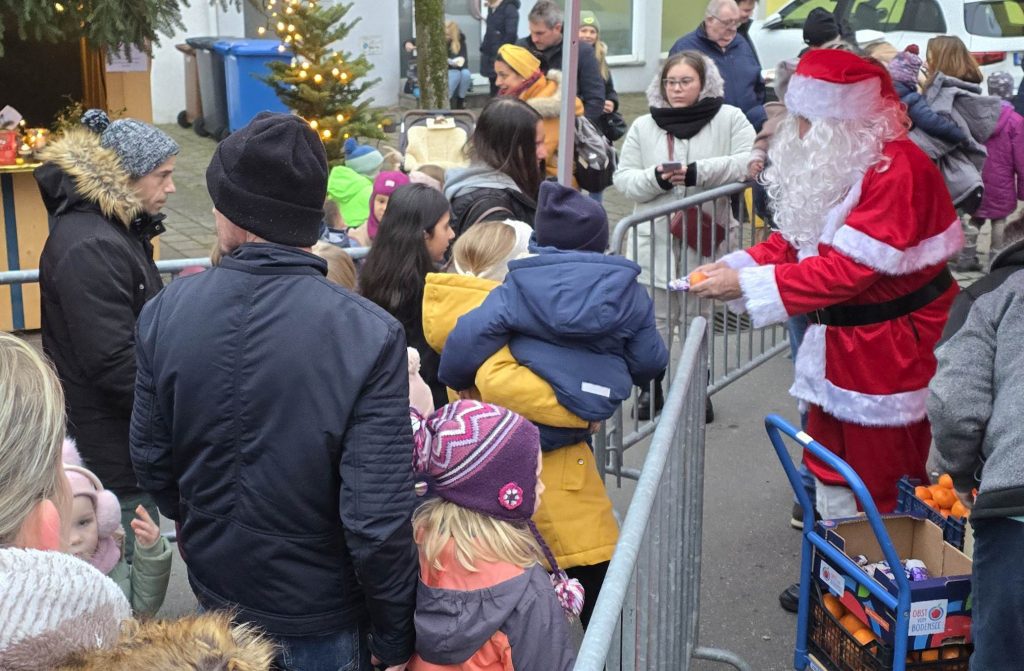 Der Platz füllte sich am Nachmittag schnell und die Kinder standen gemeinsam mit ihren Eltern Schlange, als der Nikolaus kam. Die kleinen Besucher waren zunächst noch etwas schüchtern, doch zwei Mädchen fassten nacheinander den Mut, nach vorne zu treten. Ein Mädchen sagte sogar einen Vers auf. Der Nikolaus und seine Helferinnen verteilten anschließend einen Schokoweihnachtsmann und Mandarinen oder Orangen.