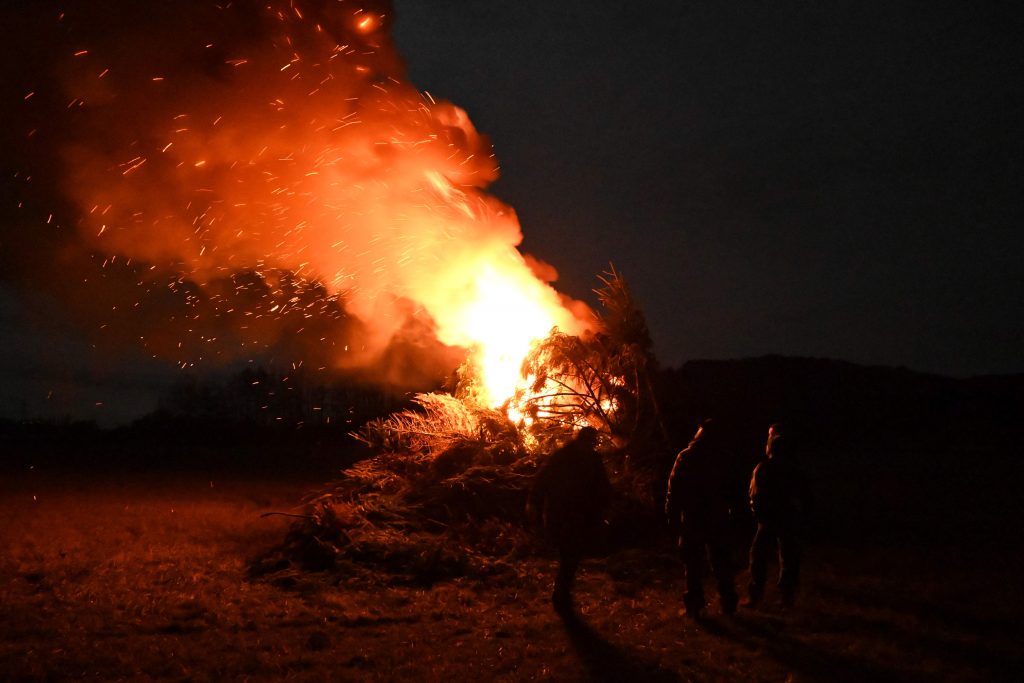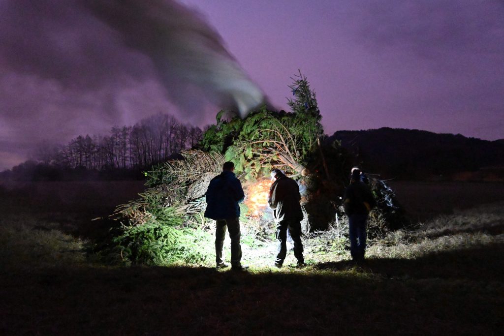 Der Haufen aus den Christbäumen der vergangenen Weihnacht hat denen, die eine Woche zuvor am eigentlichen Funkensonntag in vielen Orten angezündet wurden, aber etwas voraus: Jetzt ist das meiste trocken. So gibt es auch schnell etwas zu sehen, als einer der Männer das Anzünden übernimmt.