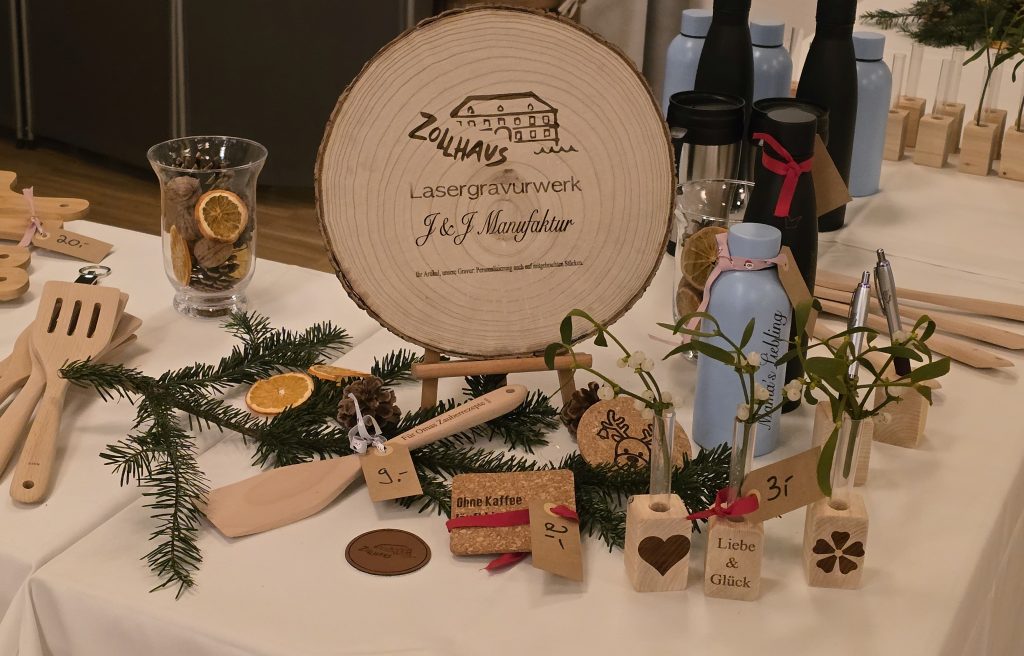 Die italienischen Öle und Nudeln von Francesco Lorusso sind zwar nicht vom Bodensee, doch er und seine Waren sind beliebt und gefragt. So war Manches dann im Lauf des Marktes sogar ausverkauft. Und so war es nicht nur bei ihm. Josha Walz vom Zollhaus-Team saß am Lasergravurgerät und gestaltete Holzbrettchen, Trinkflaschen und vieles mehr nach Wunsch mit Logo, Sprüchen oder Namen. Am Samstagabend war aufgrund der großen Nachfrage ein Teil der belaserbaren Dinge weg.
