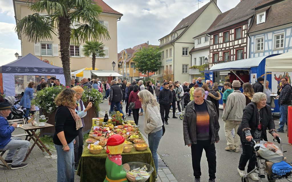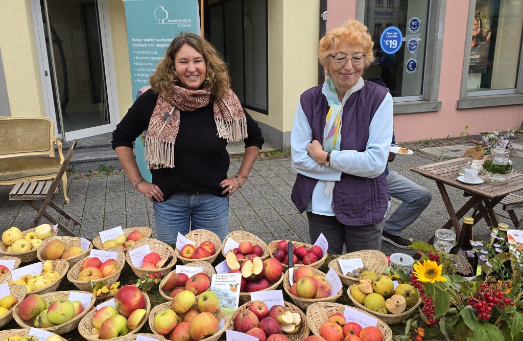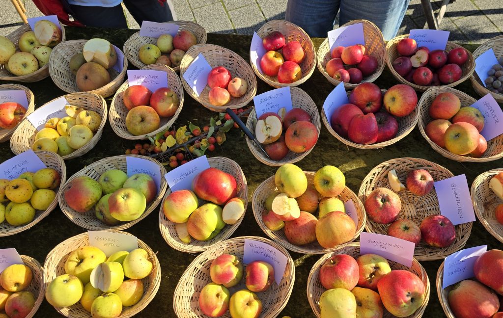 „Aber nicht alle Bäume tragen jedes Jahr“, erklärte Sabrina Molkenthin, Leiterin des Umweltzentrums. Sie und ihre Kollegen teilten Versucherle aus und kamen mit den Besuchern über die Apfelsorten sowie ein paar Birnensorten ins Gespräch. Da waren so interessante und ungewöhnliche Namen wie Kaiser Wilhelm, Goldparmäne oder Sonnenwirts-Apfel dabei. Aus den heimischen Gärten konnte man zudem die Apfelsorte bestimmen lassen und dazu Äpfel abgeben, die dann zu einem Institut eingeschickt werden.