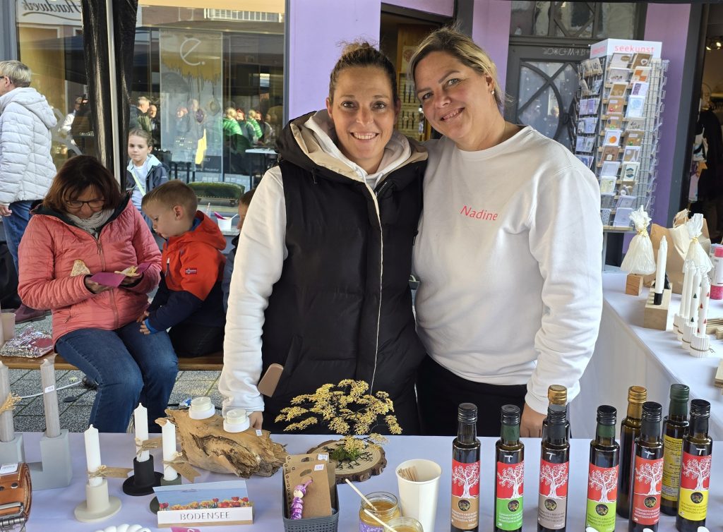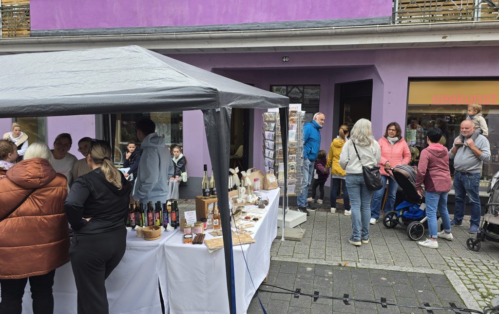 Die meisten Geschäfte hatten geöffnet und vor allem „Seekunst“ im lila Haus am oberen Ende der Hauptstraße stach mit einer großen Aktion heraus: Auch dort gab es Warteschlangen, da einerseits viele Leute die Kürbissuppe und Waffeln haben wollten und andererseits viele neugierig auf den kleinen Laden mit kreativen, handgemachten Sachen regionaler Kleinunternehmer und Künstler waren, aber nur wenige Leute gleichzeitig reinpassen.