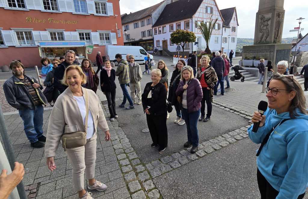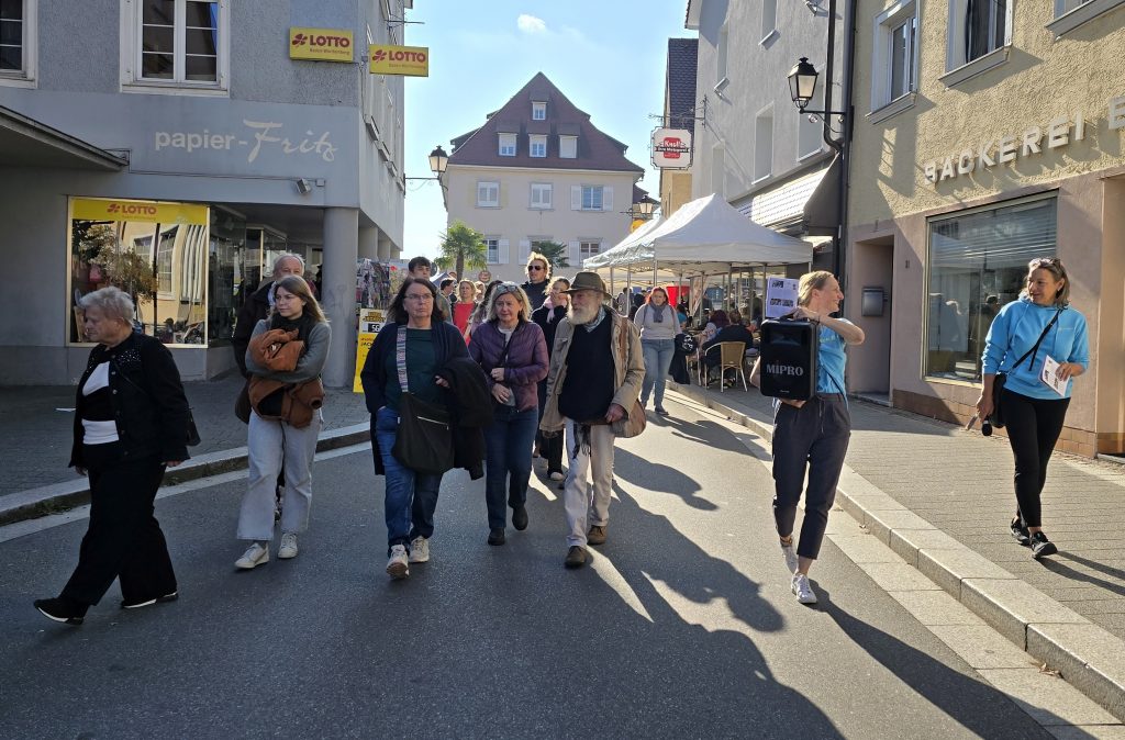 Einen besonderen Höhepunkt stellte auch der Finissage-Rundgang der Kunstmeile dar, bei dem einige der teilnehmenden Künstler dabei waren und den kunstinteressierten Teilnehmern etwas über ihre Werke und ihre Leidenschaft erzählten. Die Besucher, die zufällig dabei standen oder beim Mahlwerk oder Knoll an den Tischen saßen, kamen unerwartet in den Genuss, für ein paar Minuten Teil dieser Gruppe zu werden. Die VHS Stockach machte extra zu diesem Anlass die dortige Ausstellung „Herzmomente und Heimatgefühle“ auf, die Teil der Kunstmeile ist, aber bis zum Jahresende dauert.