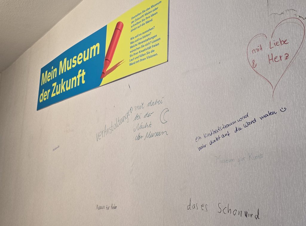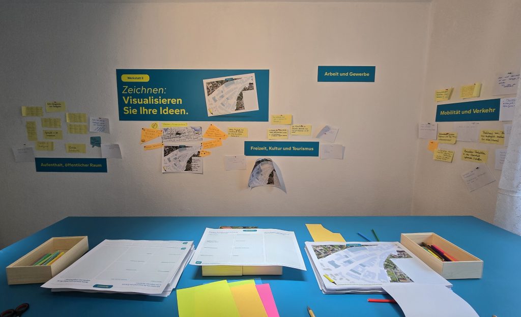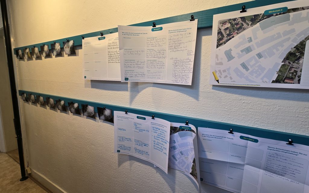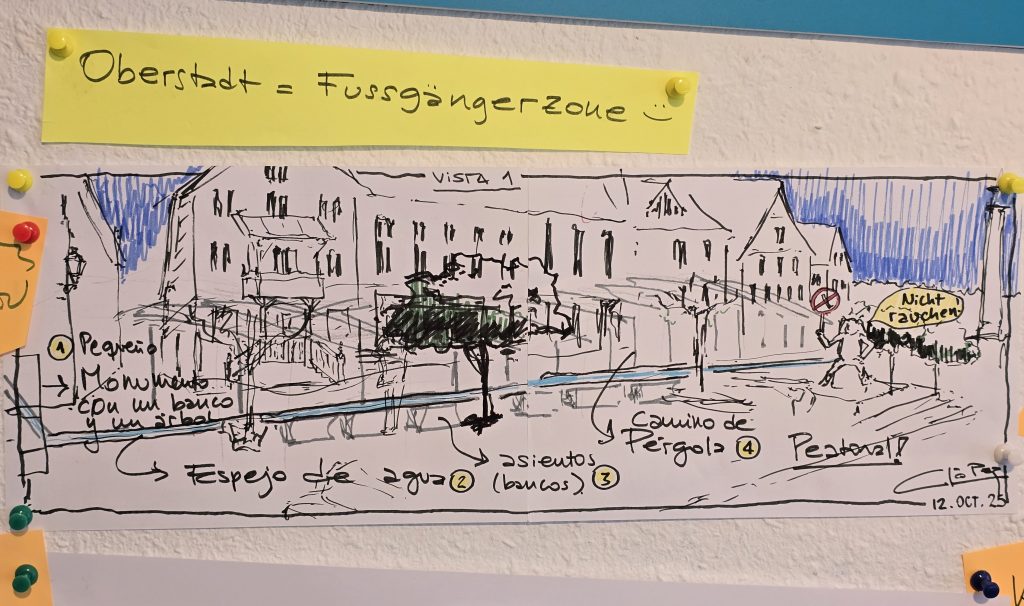 Die Einwohner nutzten eifrig das Angebot – genau so wie es gedacht war. So hingen an den Wänden der Ideenwerkstätten schnell jede Menge Anregungen und an den Klemmleisten im Flur waren viele Ergebnisse zu sehen, wie die Bürger sich das Aussehen der Innenstadt in Bezug auf Verkehrsführung, Begrünung, Gastronomie usw. vorstellen. Im Raum, in dem es um die Zukunft des Stadtmuseums geht, durfte man sogar direkt auf die Wand schreiben und ein Einwohner hatte eine künstlerische Zeichnung seiner Vision hinterlassen – vermutlich jemand, der zugezogen ist, da die Beschriftung auf Spanisch ist. Natürlich bleiben die Sachen und können ergänzt werden.