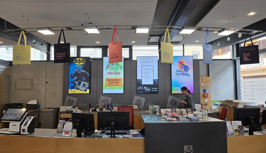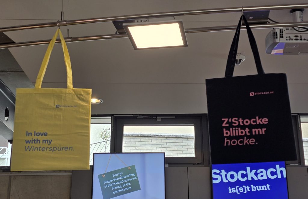 „Small Town – Big Vibes“ gibt es, doch der Spruch „Your Gate to the Lake“ hat es nicht in die Endauswahl geschafft, die nun ganz schick präsentiert über der Theken im Forstamt-Foyer schwebt. Auch andere Prototypen mit englischen Sprüchen, die im Juni im Gemeinderat gezeigt und verteilt wurden, sind nicht im Sortiment. Damit hat die Stadt auf das Feedback der Einwohner reagiert, wobei Kulturamtsleiterin Corinna Bruggaier auch erklärt, dass die damals vorgestellten Taschen noch nicht die finalen gewesen seien.