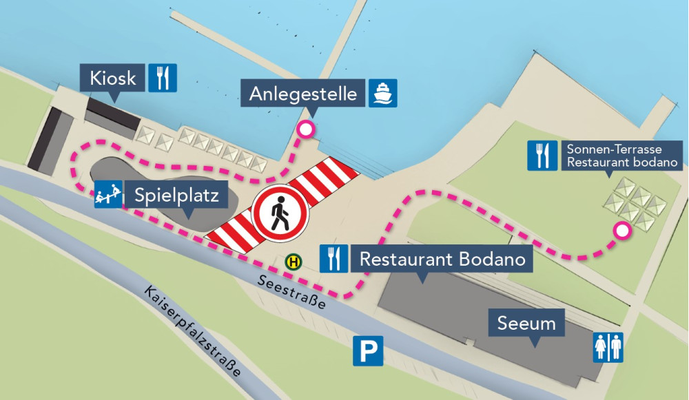 Sandra Domogalla betont, für die Fußgänger gebe es Wege um den gesperrten Bereich herum. Die Gemeinde habe dazu auf ihrer Internetseite auch Informationen und eine Karte veröffentlicht. An den Wochenenden soll es außerdem immer direkte Wege geben. Da auch ein Teil der Außenfläche des Restaurants Bodano betroffen sei, gebe es einen Ersatzbereich auf der Wiese, wo die Gäste sitzen können. „Alles wird gut ausgeschildert und erreichbar sein“, versichert sie.