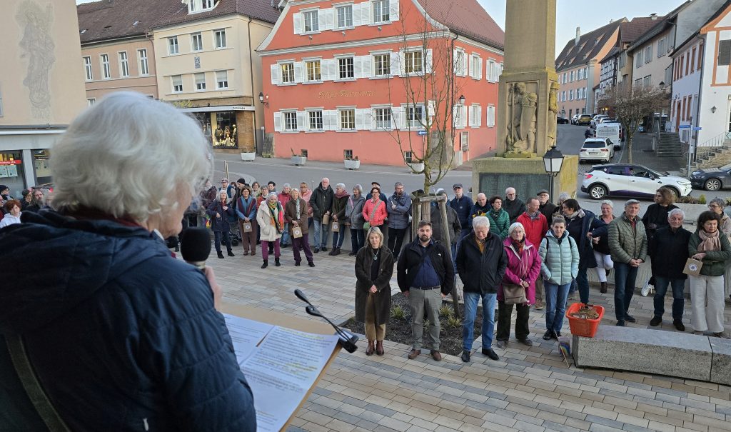 Bürgermeisterin Susen Katter griff die Bürgerbeteiligung im Honold-Haus als ein lokales Beispiel der Demokratie auf. Ebenso sei der Gemeinderat ein Element in der Demokratie. So könne jeder den Staat mitgestalten. Was passiere, wenn es soetwas nicht gebe, sehe man in anderen Ländern. Im Hinblick auf die anstehende Landtagswahl am 8. März sagte sie: „Wahlen sind keine Nebensache sondern selbstverständlich. Bitte gehen Sie wählen. Entscheiden sie nicht aus Wut, sondern informiert und überzeugt.“