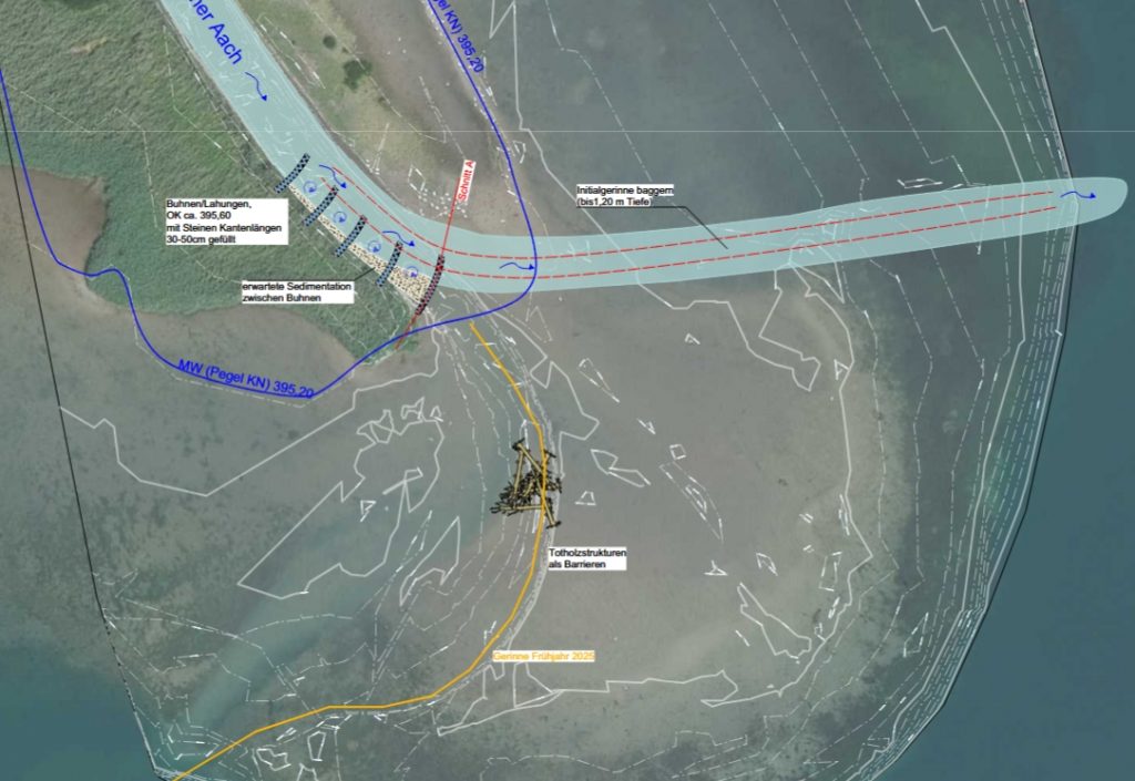 Was nun? Seng erklärte, man habe überlegt, wie der Strom wieder verlagert werden könnte. Er stellte ein Konzept vor, in dem sichelförmig mehrere naturnahe und mit Steinen gefüllte Pfahlreihen (Buhnen) den Wasserfluss zu einem neuen Initialgerinne lenken sollen.