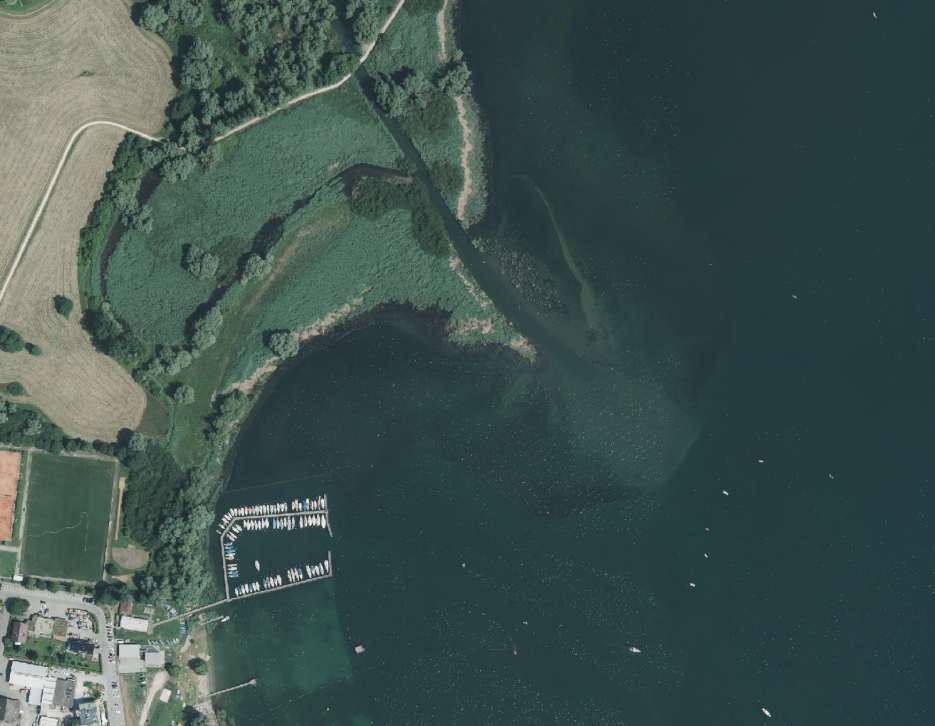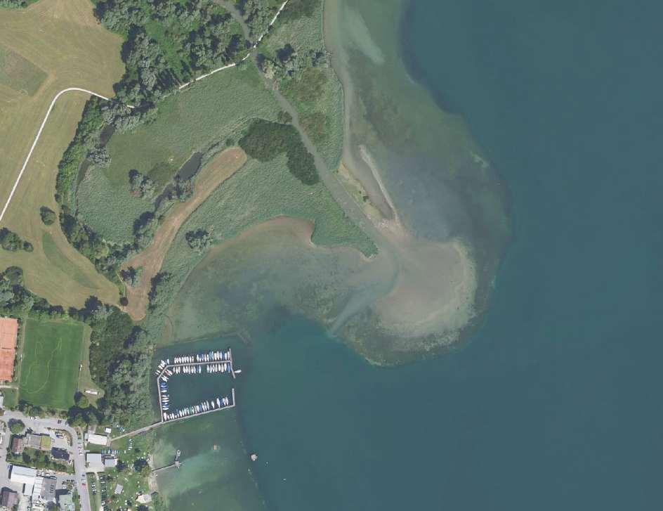 Seng zeigte anhand von Luftbildern, wie sich der Ausfluss der Stockacher Aach zunehmend in Richtung Bodman bewegt hat. 2013 sei der Ausfluss noch gerade gewesen, dann sei der Schwenk Richtung Bodman entstanden. Nun seien zunehmende Verlandungen und Sedimentablagerungen in den Häfen und dem Strandbad die Folge – bis zu 17 Zentimeter pro Jahr.