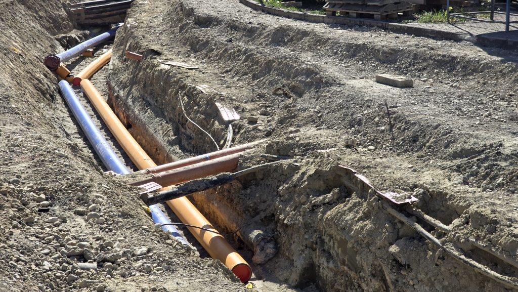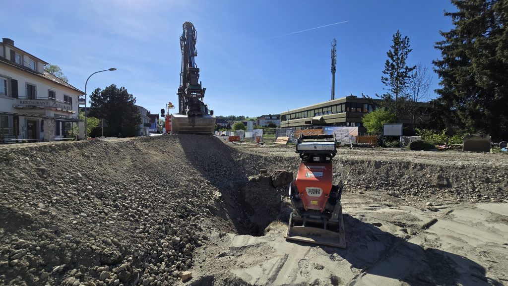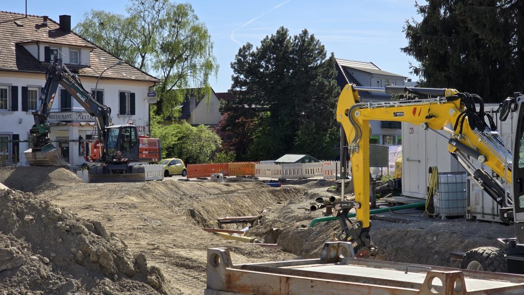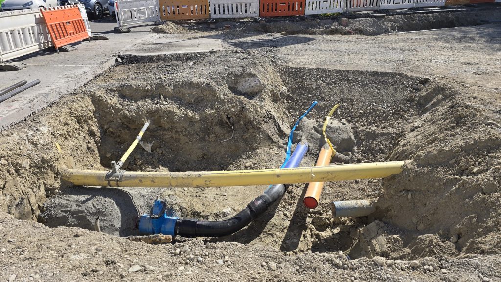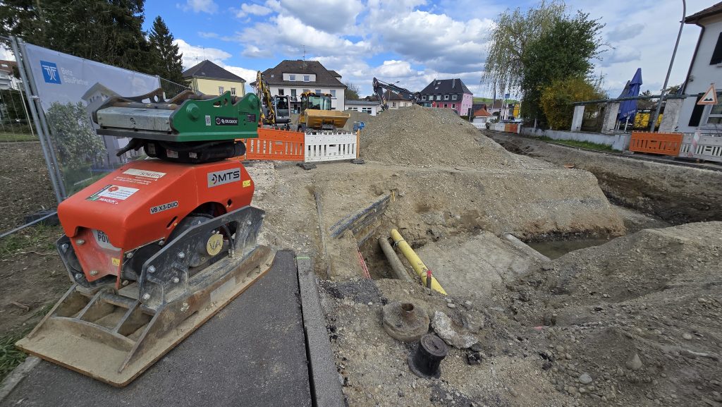 Am ehemaligen Hotel Linde ist der Tausch von Gas- und Wasserleitungen bereits abgeschlossen und fast wieder alles mit Erde bedeckt. Interessant dabei ist: Über den abgedeckten Leitungen liegen bedruckte Bänder, die darauf hinweisen, was sich weiter unten im Erdreich befindet – so kann vermieden werden, dass es im weiteren Verlauf der Straßensanierung unbeabsichtigte Schäden gibt. Entlang der gegenüberliegenden Straßenseite ist der Graben noch offen. Dort werden ebenfalls die Hinweis-Bänder mitvergraben, wenn es soweit ist.